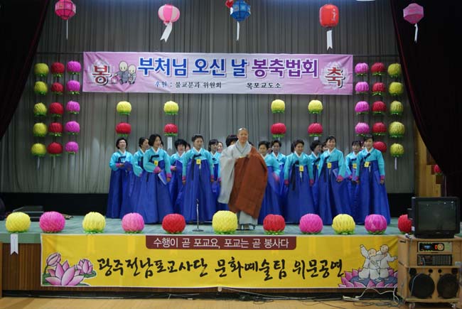- [광주전남] 광주전남지역단에서는 5월 13일 목포교도소에서 수형자들을 상대로 「부처님 오신날 봉축 큰 법회」를 실시하였다. 법회는 식전행사와 본행사로 나누어 실시하였는데, 식전행사는 지역단의 문화예술팀이 진행하고 효천스님의 독창과 목포 사암 합창단의 찬불가로 구성되었다. 식전행사로 치루어진 봉축 한마당에서 문화예술팀 팀장 우성 이현하 포교사는 불자가수 채송화․이훈․허미라 불자와 함께 직접 가요와 민요를 불렀으며, 이어서 대지행 이덕임포교사의 가야금병창, 보리심 한경자 포교사의 살풀이춤, 보리행 곽영자 불자가 판소리를 불렀다. 다음으로는 원명심 고향희포교사가 아코디언 연주를 하고 오지연 명창이 남도민요를 불렀으며 효천스님의 찬불가 독창으로 마무리 되었다. 그리고 목포사암연합회 합창단이 행사 시작과 끝 무렵에 찬불가 축가를 불러, 여느 축제 못지않은 각양각색의 소리와 악기가 다양하게 구성되어 이를 바라보는 수형자들도 한마음이 되어 즐겁고 뜻 깊은 자리가 되었다 2부에서는 봉축법요식이 이어졌으며 이종관포교사가 사회를 담당하고 법문은 목포지역 사암연합회장을 역임하고 계시는 혜원스님이 특유의 유머를 섞어 어려운 법문을 알기 쉽게 설하였다 목포교도소 법회는 정영균 현 단장이 목포 제8332부대 호국사자사 법당과 함께 교정교화위원으로 7년여를 출입하며, 목포지역 포교사를 결집 시키는 근간이 된 산실이기도 하다