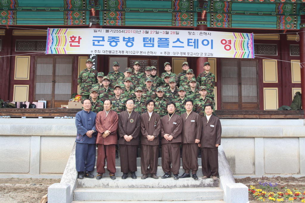 - [대구] 대구경북지역단 군포교 3,4팀에서는 3월 27일부터 28일까지 1박 2일 일정으로 23명의 군종병을 대상으로 제10교구 본사 은해사에서 템플스테이를 개최하였다.호국일승사, 수호정사, 통일안국사, 화랑선원의 군불자들을 대상으로불교의식, 목탁 습의, 불교문화제 이해, 바루 공양, 수계식 등으로 알차게 진행된 템플스테이는 군불자들의 포교를 위해 매우 유익한 프로그램이 되었다.