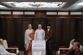 - [포교사단] 대한불교조계종 포교사단은 불기 2567(2023)년 6월 22일 오전 10시 30분 총무원 4층에서 “아름다운동 행” 이사장인 총무원장 진우 스님을 모시고 지난 4월 11일과 3월 9일 각각 발생한 산불로 전소된 대한불 교조계종 강릉 인월사와 송광사 인월암의 재건에 도움을 주고자 모금한 성금을 전달하는 자리를 가졌 다. 전체 포교사를 대상으로 모금운동을 전개하여 4월 20일부터 5월 11일 까지 자율 보시를 받아 총 3,400 만원을 모금하여 공익기부재단인 아름다운 동행에 지정 기부를 하는 자리에 총무원장 진우 스님, 아름 다운 동행 상임이사 일화 스님, 총무원 사회부장 범종 스님, 포교연구실장 법정 스님이 참석하였고 포교 사단은 범일 김영석 사단장, 여여성 정청현 사단 감사, 등혜 배동학 사단수석 부단장, 적광 류재창 사단 부단장, 성수 서정각 서울지역단장, 성불화 박해덕 경남지역단장, 지상 유희열 세종충남지역단장, 학륜 이성학 사단 사무총장이 참석했다. 총무원장 진우스님은 전달식 후 ‘포교사단이 많은 활동과 도움을 많이 줘서 고마운 마음이 있습니다.. 이렇게 마음을 모아줘서 감사드린다“며 치사를 해주시고 포교사단에 대한 활동과 전체 모임 등 궁금한 사항에 대한 물음을 김영석 사단장이 답변을 드리는 담소가 이어졌으며, 불교상담개발원의 명상센터 관 련해서 정리가 되면 포교사들의 모임에 한번 참석 하셔서 설명을 하시겠다고 말씀을 주셨다. 이어서 총 무원 로비에서 기념사진을 촬영하며 전달식을 끝냈다.