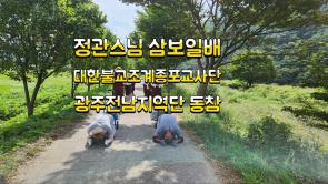 - [광주전남] 2022년 9월14일(수) 14시 정관스님 삼보일배 33일째! 남원 산동면에서! 강윤구지역단장님과 김문희부단장님 박태백감사님, 그리고 단원참석! 지난 하안거 해제후 8월13일부터 승보종찰 송광사에서 서울 조계사까지 우크라이나 전쟁종식과 전쟁으로 고통받는 어린이들을 위해 삼보일배 정진하는 정관스님을 찾아뵈었습니다. 삼보후 일배, 강윤구지역단장님과 김채신포교사님이 앞서고 뒤따라 마음을 모아 수행정진합니다. 나무석가모니불, 나무관세음보살, 나무아미타불....저마다의 염불을 하며 재발심을 합니다. 큰냇가에 물이 흐르고 낙엽이 물들어가는 초가을 들녘에 별꽃이 사랑스러워요. 논에는 벼가 익어가고 있어요. 정관스님께서는 삼배를 하는 자체가 전쟁없이 온 생명이, 온 우주가 하나라고 강조하십니다. 우리나라 우리불교 우리와 나에 대한 분별심을 갖지 않고~사람, 나무, 구름, 산, 물 이 모두가 하나임을 강조하시며 한걸음 한걸음 평화를 위한 수행자의 길을 가시는 정관스님을 응원합니다.