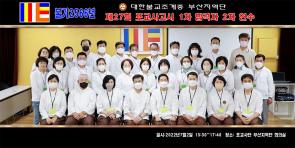 - [부산] 제27회 일반포교사 1차 합격자 부산지역단 2차 연수 일시:불기2566(2022)년도 일반포교사 합격자 2차 연수 장소: 부산지역단 사무실 교육대상:제27회 1차 합격자 전원 집전:(해담) 임한규부단장 사회:(정관) 강태산 사무국장