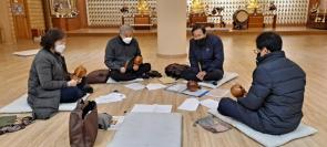 - [울산] 무아팀 조문염불 목탁습의 교육 날짜 : 2022.2.23.수요일 .19시 장소 : 해남사 보광당 삼귀의와반야심경을 시작으로 법광 이춘훈팀장님의 간단한 공지사항에 이어 명산 황영규님의 조문염불 목탁습의 진행하였으며, 코로나19로 어려운상황이었으나 무아팀의 열정으로 팀교육을 실시하였다. 명산 황영규님의 팀원들이 알아들을수 있게 차근차근 상세한 설명과 목탁에 맞추어 열심히 염불연습을 하였으며 유익한 시간을 가졌다. 사홍서원을 끝으로 회향하였다. 참석자 : 법광 이춘훈팀장, 명산 황영규님 ,보현주 김수영님, 도일 최병옥님 ,인향수 곽외화님 , 5명 글 ; 권영심/무비심/24기