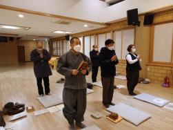 - [울산] 1월25일(화요일) 통도사 말사 해남사에서 월례회를 가졌습니다. 이우상 범영님, 김영길 천안님, 최창현 법운님, 류동기 각성님, 정동례 수월심님, 정문엽 수진향님, 이태용 심공님, 한찬욱 무구님이 참석하셨습니다. 보광당에서 이우상 팀장님의 집전으로 삼귀의, 오분향례, 칠정례, 반야심경의 순으로 저녁예불을 올렸습니다. 예불을 마치고 다과를 먹으면서 팀활동에 관한 사항과 운영위원회 회의내용을 전달하고 신입 법우님이 계셔서 서로 본인 소개를 하면서 화기애애하게 모임을 가졌습니다. 끝으로 사홍서원으로 회향하였습니다. 모두 수고하셨습니다. 감사합니다. 글: 정문엽/수진향