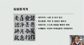 - [서울] 불기 2566(2022)년 2월 6일 대한불교조계종 포교사단(단장 성수 서정각) 서울지역단 서부총괄팀 군3팀이 호국일취사의 군장병에게 영상 법회를 열었다. 범운 황동욱 포교사는 칠불통계게에 대해 알기쉽게 설명했다. 그는 제악막작이란 나쁜 행동을 하지 않는 것이고 중선봉행이란 착한 행동을 받들어 행하는 것이고 자정기의란 스스로 마음을 깨끗이 하는 것이며 시제불교란 이것이 부처님의 가르침이라는 것을 안다는 것이라고 설명했다. 그는 나쁜 행동이란 악업으로서 세상에서 손가락질을 하는 행동을 의미하며 미워하는 것은 성격이 되고 악화되고 악취하게 되면 윤회하게 된다고 설명했다. 좋은 일이란 선업으로서 세상에서 칭찬하는 것으로서 사랑하면 성격이 좋아지고 선취로서 윤회하게 된다고 말했다. 범운 황동욱 포교사는 자정기의란 과거의 악업을 참회하고 선업을 증장하며 청정행으로 모든 고통에서 벗어나서 열반적정을 성취하는 것이라고 설명했다. 그는 장병들에게 일상 속에서 착한 일을 많이하고 나쁜 일을 가급적 자제해서 단체생활과 사회생활에서 유익하고 꼭 필요한 존재로 살았으면 좋겠다고 말했다. 한편, 대한불교조계종 포교사단 서울지역단 서부총괄팀 군3팀은 호국일취사에서 군장병에게 꾸준하게 부처님의 가르침을 전하고 있다.