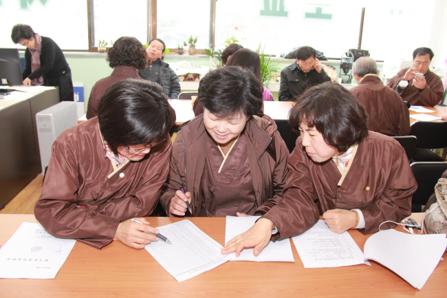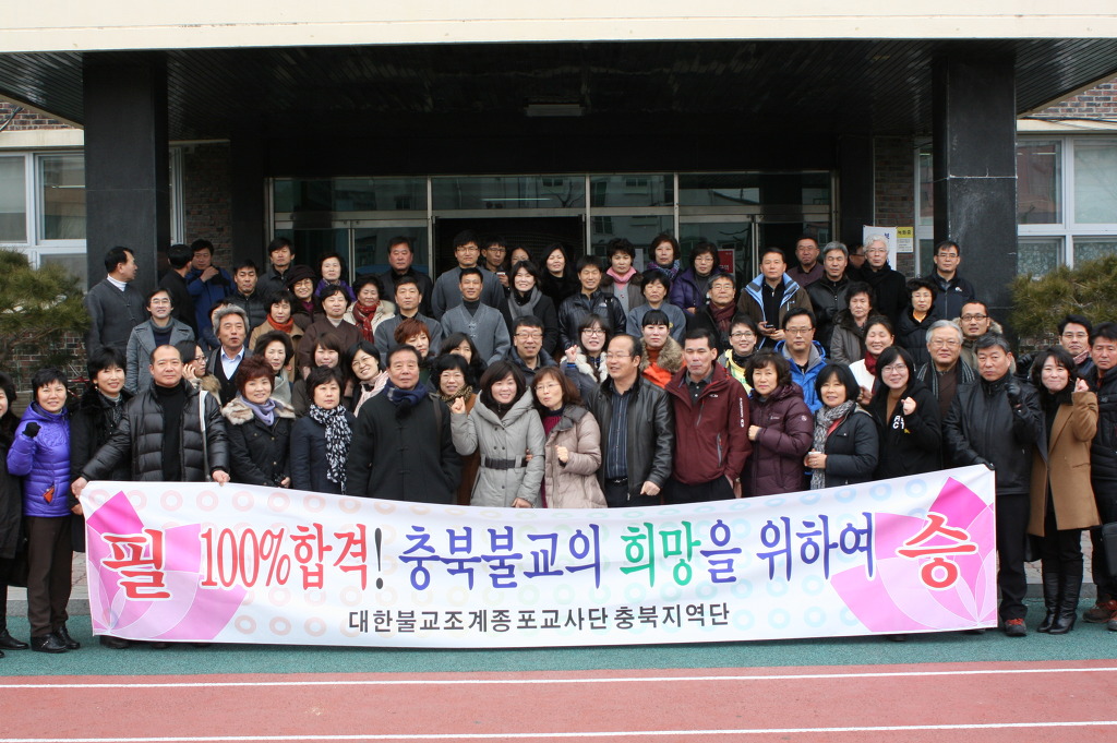 - [] 이미 각오는 단단히 하였다.그동안 쪽집게 선생님에게서 열심히 배운 실력을 유감없이 풀어내리다. 후배들을 격려하는 우리는 다소 여유로운 시간도 가질수있으련만 표정들은 밝으면서도 다소 긴장된 표정이다. 충북지역단 법천 김혜작 단장님의 인사와합격발원 격려사 시험생들이 시험을치르는동안 선배 포교사들은 5층 법당에서 합격발원 기도로 108배를 시작하였다
