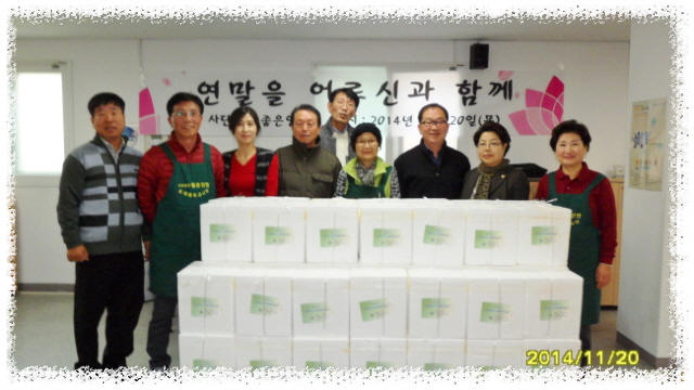 - [좋은인연] 함께 나누어 행복합니다 바람에 떨어지며 흩날리는 낙엽을 바라보고, 낙엽도 밟아도 보면서, 한해를 보내는 겨울 초입에서 종일 눈발이 흩날리는 가운데, 좋은인연(이사장 곽명희)은 2015년 11월 26일 10시 성북구 안암동 주민센타에서 ‘사랑의 김장나누기’ 행사를 가졌다. 소외계층의 건강한 겨울나기를 위해 마련한 이번 행사에는 ‘좋은인연’회원, 포교사단 전임단장단 모임 ‘수메다’회원, 포교사단 임원진, 성북구 서강덕 안암동장과 윤만환 구의원 등, 50여 명이 동참했다. 이번에 만들어진 김장은 성북구 관내에 거주하는 독거노인, 소년소녀가장, 청소년가장 등 형편이 어려운 150여 가정에 전달한다. 좋은인연은 2006년 창립 첫해부터 매년 성북구 관내에 거주하는 형편이 어려운 소외계층 가정을 대상으로 ‘사랑의 김장나누기’ 행사를 시행해 왔다.