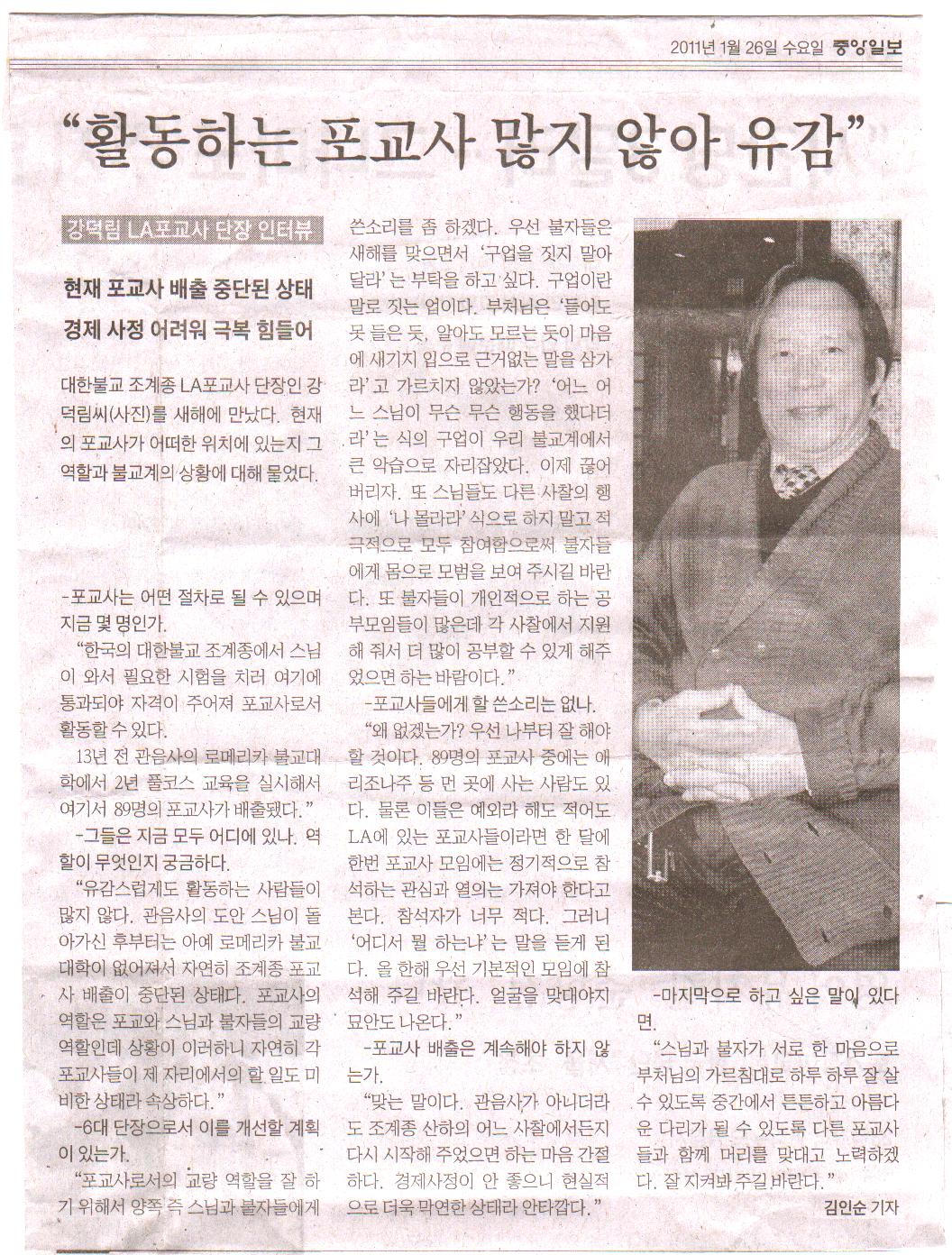 - [LA] 강덕림 LA포교사 단장 인터뷰 "활동하는 포교사 많지 않아 유감"[LA중앙일보 11.1.26] 대한불교 조계종 LA포교사 단장인 강덕림씨(사진)를 새해에 만났다. 현재의 포교사가 어떠한 위치에 있는지 그 역할과 불교계의 상황에 대해 물었다. -포교사는 어떤 절차로 될 수 있으며 지금 몇 명인가."한국의 대한불교 조계종에서 스님이 와서 필요한 시험을 치러 여기에 통과되야 자격이 주어져 포교사로서 활동할 수 있다. 13년 전 관음사의 로메리카 불교대학에서 2년 풀코스 교육을 실시해서 여기서 89명의 포교사가 배출됐다." -그들은 지금 모두 어디에 있나. 역할이 무엇인지 궁금하다."유감스럽게도 활동하는 사람들이 많지 않다. 관음사의 도안 스님이 돌아가신 후부터는 아예 로메리카 불교대학이 없어져서 자연히 조계종 포교사 배출이 중단된 상태다. 포교사의 역할은 포교와 스님과 불자들의 교량 역할인데 상황이 이러하니 자연히 각 포교사들이 제 자리에서의 할 일도 미비한 상태라 속상하다." -6대 단장으로서 이를 개선할 계획이 있는가."포교사로서의 교량 역할을 잘 하기 위해서 양쪽 즉 스님과 불자들에게 쓴소리를 좀 하겠다. 우선 불자들은 새해를 맞으면서 '구업을 짓지 말아 달라'는 부탁을 하고 싶다. 구업이란 말로 짓는 업이다. 부처님은 '들어도 못 들은 듯 알아도 모르는 듯이 마음에 새기지 입으로 근거없는 말을 삼가라'고 가르치지 않았는가? '어느 어느 스님이 무슨 무슨 행동을 했다더라'는 식의 구업이 우리 불교계에서 큰 악습으로 자리잡았다. 이제 끊어 버리자. 또 스님들도 다른 사찰의 행사에 '나 몰라라'식으로 하지 말고 적극적으로 모두 참여함으로써 불자들에게 몸으로 모범을 보여 주시길 바란다. 또 불자들이 개인적으로 하는 공부모임들이 많은데 각 사찰에서 지원해 줘서 더 많이 공부할 수 있게 해주었으면 하는 바람이다." -포교사들에게 할 쓴소리는 없나."왜 없겠는가? 우선 나부터 잘 해야 할 것이다. 89명의 포교사 중에는 애리조나주 등 먼 곳에 사는 사람도 있다. 물론 이들은 예외라 해도 적어도 LA에 있는 포교사들이라면 한 달에 한번 포교사 모임에는 정기적으로 참석하는 관심과 열의는 가져야 한다고 본다. 참석자가 너무 적다. 그러니 '어디서 뭘 하는냐'는 말을 듣게 된다. 올 한해 우선 기본적인 모임에 참석해 주길 바란다. 얼굴을 맞대야지 묘안도 나온다." -포교사 배출은 계속해야 하지 않는가."맞는 말이다. 관음사가 아니더라도 조계종 산하의 어느 사찰에서든지 다시 시작해 주었으면 하는 마음 간절하다. 경제사정이 안 좋으니 현실적으로 더욱 막연한 상태라 안타깝다." -마지막으로 하고 싶은 말이 있다면."스님과 불자가 서로 한 마음으로 부처님의 가르침대로 하루 하루 잘 살 수 있도록 중간에서 튼튼하고 아름다운 다리가 될 수 있도록 다른 포교사들과 함께 머리를 맞대고 노력하겠다. 잘 지켜봐 주길 바란다." 김인순 기자