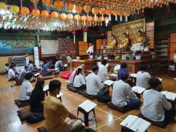 - [울산] 8월1일 선우팀은 코로나로 인해 요양원봉사는 못가고 양산 정종사에서 통도사내 서운암 하안거 선방스님들께 대중공양에 동참 했습니다. 짧은시간 음식을 만들어야 했던 상황에 선우팀의 동참은 큰 도움이 되었다는 스님의 말씀에 기뻤습니다. 점심 공양후 삼천불전에서 예불을 마치시고 모든 보시는 부처님법에 어긋남없이 항상 부처님을 염하고 부처님께 올린다는 맘 자세로 행하면 무루복으로 공덕이될것이지만 그렇치 않음 유루복으로 복덕은 남아 있을것이다.란 정종사 주지스님의 법문에 각자의 맘자리를 살폈을 겁니다. 모든 일정 마치고 스님께서 사주신 시원한 차 한잔에 폭염도 사라진듯 했습니다. 작성자:박정현/화엄행