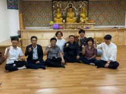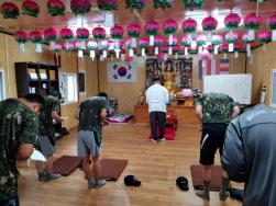 - [울산] 7월 26일 후덥지근한 날씨속에 문수.보현팀은 연대호국사에서 법회를 가졌습니다. 보기만해도 믿음직한 우리장병들이 29명이나 나왔습니다. 인원에 연연해하지말자고 되뇌이면서도 마스크를 쓰고 나온 이숫자가 얼마나 감사한지 모르겠습니다. 도성님의 집전으로 법회를 진행하였는데 총기있게 잘 따라하는부분이 있는가 하면 부족한 부분도 있었습니다. 그러고 보니 처음 법회를 나온 장병들이 대다수 인듯 했습니다. 아뿔사, 늘 법회시작 전에 법당예절 등을 이야기하며 분위기를 풀어가며 시작했었는데 오늘은 그과정을 빠뜨렸습니다. 항상 한명이라도 처음 나오는 이를 챙기기위함이었는데 특별히 신참이 많은 오늘 다른 분주함으로 그 과정을 빠뜨렸습니다. 처음 법당문을 열고 들어오는 그 발길의 고마움이 계속 연결될수 있도록 더 세세히 신경을 써야겠습니다. 장마 뒤 인지라 법당 한쪽에 흥건히 빗물이 고여있어 그 곳 청소한다고 땀은 많이 흘렸지만 그래도 오늘은 참 감사한 날이였습니다. 집전하신 도성님 수고 많으셨습니다. 덕분입니다^^ 작성자:박성희/향림성