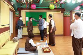 - [강원] 제25회 일반포교사 고시 1차합격자 집체교육이 불기2564년 8월 8일(토) 10:00시부터 지역단 사무실에서 있었습니다. 비가 세차게 오는 토요일임에도 합격자 27명 전원이 참석하여서 포교사의 자세 및 강원지역단의 이해와 조직 ㆍ 목탁집전 및 각 의례별 집전방법을 연마하고 포교사고시 합격자로서 정체성 확립과 함께 포교사 활동에 대하여 연수를 받았습니다.ㆍ 2차 면접은 9월12일 월정사에서 있을 예정이며 최종합격일은 10월23일 입니다. 일반 강의해 주신 지역단 김효현단장과 목탁집전 교육을 해주신 전상웅 전 지역단장 신규포교사들을 응원해주기 위해 오신 각 총괄팀장들께도 감사의 인사를 보냅니다. 모두모두 수고 많으셨습니다