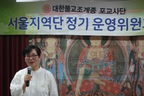 - [서울] 불기 2564(2020)년 5월 13일 19시 대한불교조계종 포교사단 서울지역단 제3차 운영위원회의가 포교사단 교육관에서 열렸다. 코로나바이러스감염증19의 사회적거리두기 지침에 따라 마스크를 착용하는 등 정부지침을 준수하여 회의가 진행됐다. 삼귀의와 우리말 반야심경으로 시작했고 사회는 호당 전호균 수석부단장 포교사가 보았고 집전은 본자연 장희자 염불포교팀장이 맡았다. 이번 운영위원회의에는 박상희 연등회보존위원회 연구위원과 김낙현 연등회보존위원회 실무자가 참석해 오는 5월 23일의 연등회 행사에 대한 설명회가 있었다. 박상희 연구위원은 "코로나19 국가재난상황에서 연등회가 열리게 되었는데 이번 연등회에 마스크와 장갑 착용이 의무화되었고 방역과 예방을 철저하게 해서 여법하게 행사가 마무리되는데 포교사들이 많은 도움을 주었으면 좋겠다"면서 "힘들고 어려운 상황인 만큼 부처님의 뜻에 따라 포교사들이 힘을 합쳐 연등회가 무사히 잘 치르길 빈다"고 말했다. 김낙현 실무자는 "동국대학교에서 법회를 하고 연등행렬 같은 경우에도 기존에 비해서 약 3분의 1이상이 줄어들었는데 코로나19로 인해 어쩔 수 없는 상황이며 국가 지침에 따라서 행사가 여법하게 진행되는데 포교사들의 도움이 많이 필요하다"면서 "행렬 선두와 장엄등 등 포교사들이 질서있게 봉사를 해주길 부탁드린다"고 말했다. 서울지역단 여여성 정청현 단장은 "이번 연등회는 기존과 다르게 운영이 될 수밖에 없는 상황인데 어려운 때 일수록 포교사들이 힘을 합하여 코로나19로 어려움을 겪는 분들에게 희망의 등불을 밝혔으면 좋겠다"고 말했다. 이날 포교사단 정기대의원총회 안건 찬반투표가 전자투표가 시작되었는데 5월 18일(월요일)까지 투표권이 있는 운영위원은 반드시 투표에 참여하길 바란다는 공지도 전달됐다. 또 오는 6월 10일에 백만원력 결집불사 발우저금통 전달식이 총무원에서 있을 예정인데 5월 12일 기준 서울지역단의 총 모금액은 6,180,600원이고 동참한 포교사는 138명으로 아직 참여하지 않은 포교사는 5월 말까지 참여할 수 있기 때문에 참여하면 좋겠다는 의견도 나왔다. 한편, 포교사단 서울지역단 염불대회 접수를 5월 15일(금요일)까지 받고, 오는 5월 16일(토요일) 오전 10시에 포교사단 염불대회 참가자 선발을 위한 1차 테스트가 포교사단 교육관에서 실시될 예정이다.