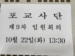 - [포교사단] 불기2568(2024)년 10월 22일 오후 1시 30분, 대한불교조계종 포교사단의 제9차 임원회의가 포교사단 교육관에서 본단 및 지역단 임원들이 참석하여 개최됐다. 김영석(범일) 포교사단장과 본단 임원, 각 지역단 단장이 참석한 9차 임원회의는 강의수(희재) 사단 수석부단장의 성원보고와 의장의 개회선언으로 시작됐으며 의식에 이어 전 회의 결과 보고와 의장 주관으로 심의 안건, 토의 안건 등을 처리 했다. 심의안건 - 안건 1. 2024년 포교사단 예산안 추경 건 - 안건 2. 2025년 포교사단 사업계획 및 예산안 심의 건 토의 안건 - 토의안건 1. 현안 논의 - 토의안건 2. 불교문화해설사 지자체 지원금 사업을 위한 방안발표 - 토의안건 3. 불교문화해설사, 명상지도사 보급 방안 - 토의안건 4. 기타 안건 토의안건 후 공지사항과 사홍서원을 끝으로 제9차 임원 회의를 마쳤다.