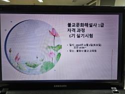 - [포교사단] - 일시 : 2024년 11월 2일(토) 10시~오후 4시반 - 장소 : 불광사 교육원 - 응시자 : 총64명중 61명 / 3명 결시 불교문화해설사 1급 6기 과정은 12/28 필기시험이 남아 있다. 수준이 높아진 실기시험과 필기시험의 좋은 결과를 더하여 모두 합격하기를 기원한다.