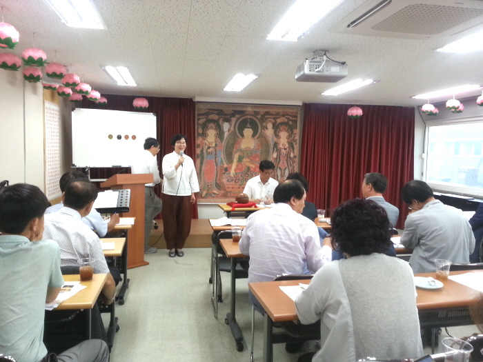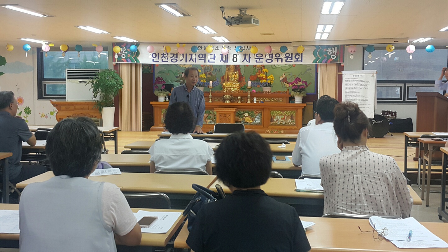 - [인천경기] 제8차 운영위원회 회의 포교사단 인천경기지역단 제8차 운영위원회 회의가 불기 2562(2018)년 8월9일 목요일 오후7시 운영위원 24명이 참석하여 등혜 배동학 수석부단장의 사회와 수연성 백순심 부단장의 집전으로 삼귀의례, 한글반야심경독송, 단장 인사말, 경과보고, 감사보고, 안건심의, 공지사항, 사홍서원으로 진행 되었다. 무인 신호승 단장은 인사말에서 연이은 무더운 날씨에도 포교활동에 임하시는 운영위원들에게 감사를 표했고 더위에 지치지 않게 건강 잘 챙기시라 당부하셨다. 이어 권태근감사의 2018년 상반기 감사보고가 있었고 안건심의와 공지사항 전달등으로 회의를 마쳤다. 이번 회의에는 디지털대학 양흥식 교학처장이 방문하여 2019년 개편되는 디지털대학 전문포교사과정에 대한 자세한 설명이 있었다.