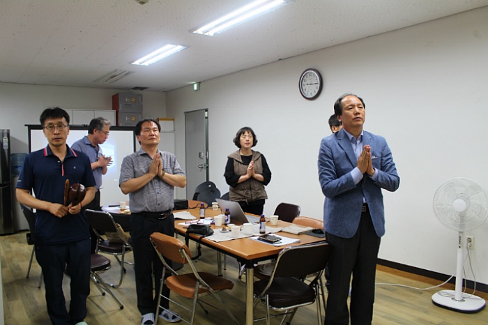 - [경북] 2018.7.5 (목) 19:00 단사무실에서 임원회의가 개최 되었습니다.남부총괄팀장(성관 김호근) 집전으로 예불의식 후 이희철 단장의 간단한 인사와 경과보고 및 안건심의 공지사항 순으로 진행되었다.