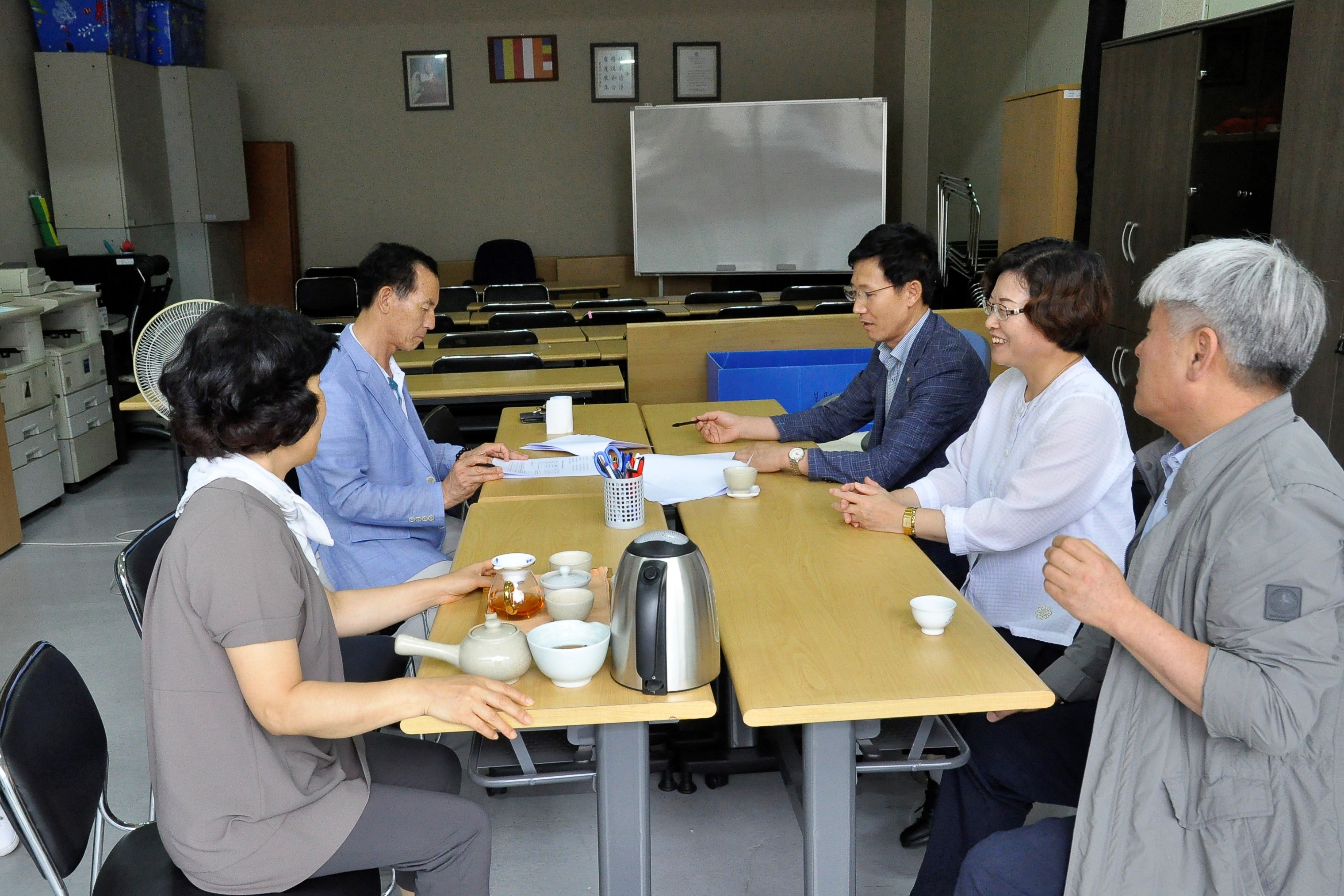 - [포교사단] 포교사단 단복개선 TF회의가 불기2562년 6월 21일 14시 30분 사)좋은인연 사무실에서 있었다. 포교사단에서는 그동안 수차례 단복개선을 시도하려는 의도는 있었지만 실행에 옮기지는 못했었다. 포교사단집행부는 차츰 시간을 두고 서서히 단복을 개선해 나가기로 결의하고 그 첫 단계로 올해는 기존의 단복을 간편하고 맵시 있게 살짝만 바꾸기로 하고 시작에 들어갔다. 단복은 전국의 포교사들이 오랫동안 입어야 하는 법의이므로 급한 시일 내로 빨리 바꾸는 것 보다는 시간을 두고 서서히 심사숙고하여 바꾸기로 한 것이다. 이번 회의는 전국의 지역단에서 추천한 1명씩의 의복에 조예가 깊은 포교사들과 인드라망이 참석하였고 앞으로도 이 인원이 지속적인 회의를 거쳐 편리하고 멋진 단복을 만들어 낼 것이다. 이날 윤기중 단장은 회의에 참석한 포교사들에게 단복개선위원 임명장수여를 하였는데, 위원장은 포교사단 장용숙 부단장이 맡게 되어 이 인원들을 이끌게 된다.