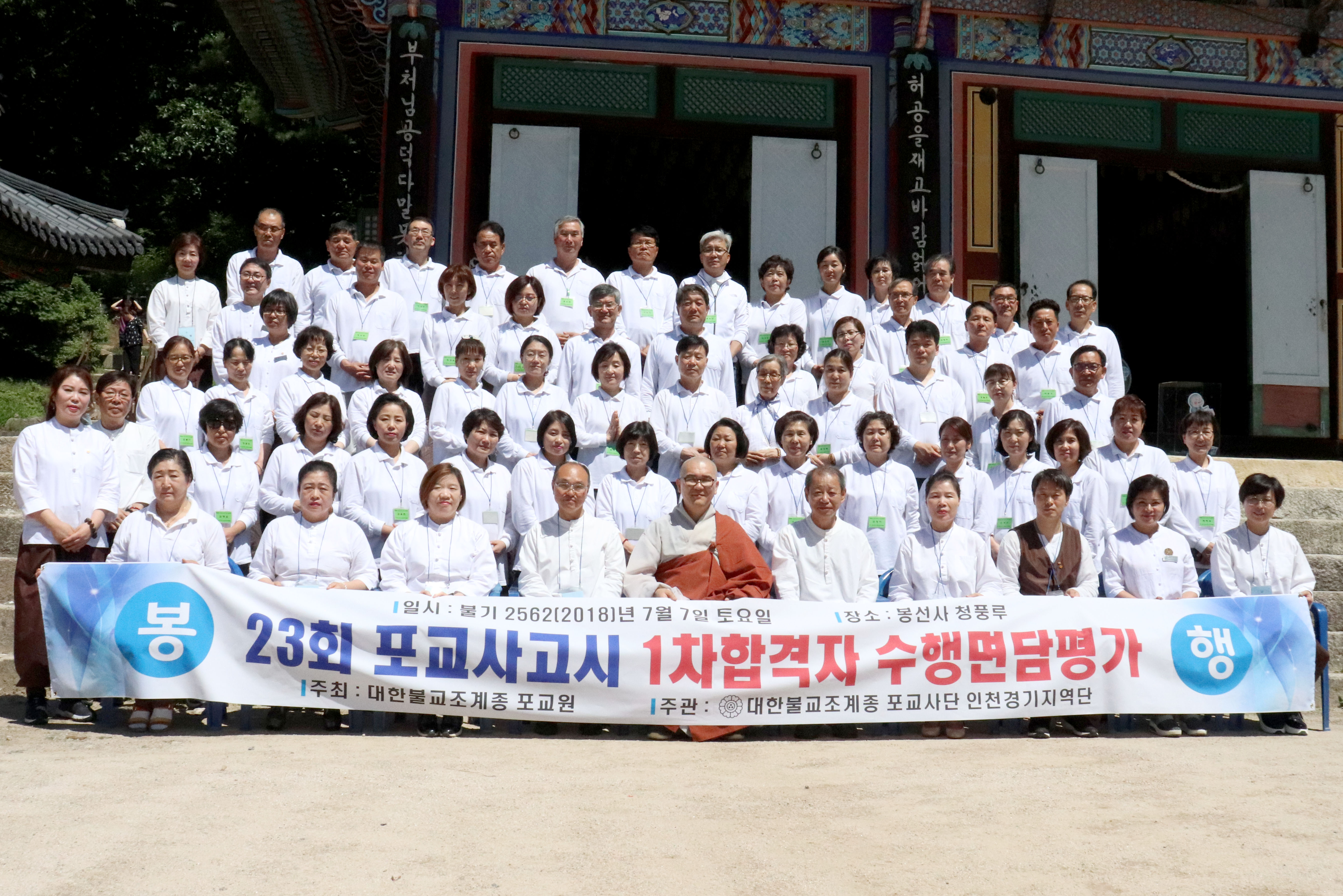 - [인천경기] 23회 포교사고시 1차합격자 수행면담평가 불기 2562(2018)년 7월7일 (토) 25교구본사 봉선사 청풍루에서 배동학 수석부단장의 사회,어윤식 동부총괄팀장의 집전으로 23회 포교사고시 1차합격자 수행면담평가를 봉행 했다.삼귀의- 한글반야심경-붓다로살자 낭독 후 신호승 지역단장의 인사말지역단 지도법사이신 봉선사 포교국장 용안스님의 환영사가 있었고 큰법당 앞에서 단체사진 촬영과 정진경, 최정숙포교사의 지도로 포교사의 노래 강습,점심공양, 면담평가, 1080배 수행정진, 공지사항전달, 사홍서원순으로 진행 했다.용안스님과 단장 부단장은 세군데 장소에서 인성및 태도, 포교사의 자세에 대한 평가, 신행 활동과 포교 활동 계획, 내림목탁, 2분스피치에 대한 평가를 하였다.무더운 날씨에 평가해주신 용안스님과 신호승단장님, 부단장님들면담평가가 원활히 진행되도록 도움주신 포교사님들, 이른 아침 나와 행사에 도움 주신 봉선사 포교사회 포교사님들, 그리고 51명의 1차합격자분들 수고 많이 하셨습니다.좋은 결과 있어 팔재계수계실천대법회에 모두 만나기를 기대해봅니다.