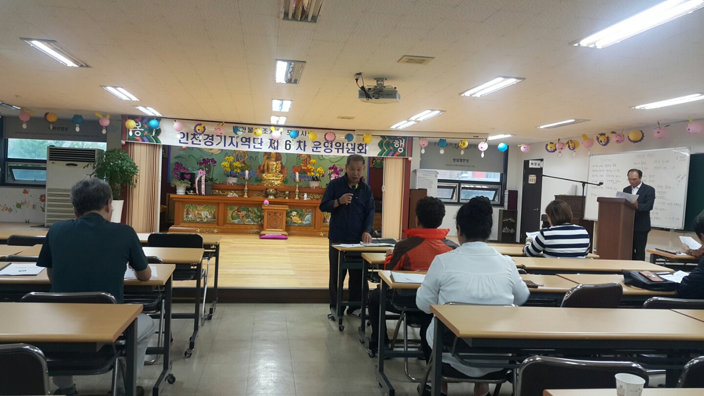 - [인천경기] 제5차 운영위원회 회의 불기 2562(2018)년 5월10일 오후7시 지역단 사무실에서 제5차 운영위원회 회의를 운영위원 20명이 참석하여 배동학 수석부단장의 사회와 백순심 부단장의 집전으로 삼귀의 ,한글반야심경봉독, 포살법회,단장인사말, 경과보고, 안건심의, 공지사항, 사홍서원순으로 진행 하였다.붓다로 살자 실천 계획의 일환으로 포교원에서 제작한 포살법회 의식집으로 지난달에 이어 두번째로 포살법회를 봉행 하였다.신호승 단장은 인사말에서 부처님오신날을 맞아 인천에서 행해진 연등축제가 여법하게 진행됨을 감사하게 생각하고 며칠뒤 행해지는 수원연등축제에서도 많은 도움을 당부하시고 어려움속에 힘듬을 이겨내고 우리의 자리를 찾아가자고 하셨다.이어 안건심의와 공지사항 전달등으로 회의를 마쳤다.