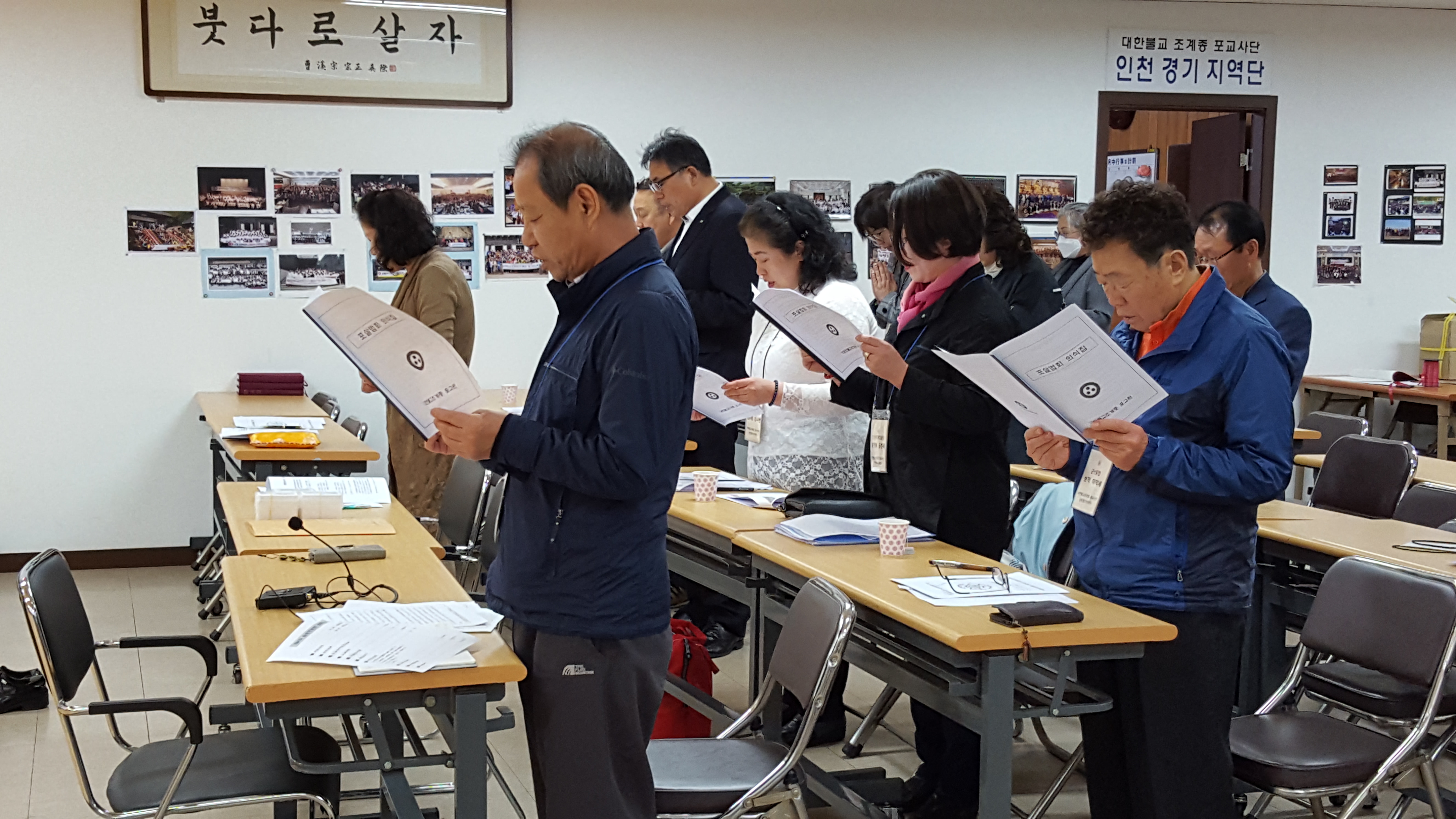 - [인천경기] 제4차 운영위원회 회의 포교사단 인천경기지역단은 불기 2562(2018)년 4월12일 목요일 오후7시 지역단 사무실에서 제4차 운영위원회 회의를 운영위원 26명이 참석하여 배동학 수석부단장의 사회와 백순심 부단장의 집전으로 삼귀의,한글반야심경봉독, 포살법회, 단장인사말, 경과보고, 안건심의, 임명장수여, 공지사항, 사홍서원 순으로 진행 하였다.붓다로 살자 실천 계획의 일환으로 포교원에서 제작한 포살법회 의식집으로 운영회의에서 처음으로 모두 같이 합송하는 것으로 포살법회를 봉행 하였다.신호승 단장은 인사말에서 열심히 해주셔서 감사하다. 과욕하지 마시고 팀원들간의 갈등 초래하지 않고 원만한 팀활동이 되도록 노력해달라 당부 하셨다.꽃샘추위와 봄꽃 향기, 변덕스러운 날씨에도 많이 참석해 주시어 여법하게 회의를 마쳤다.