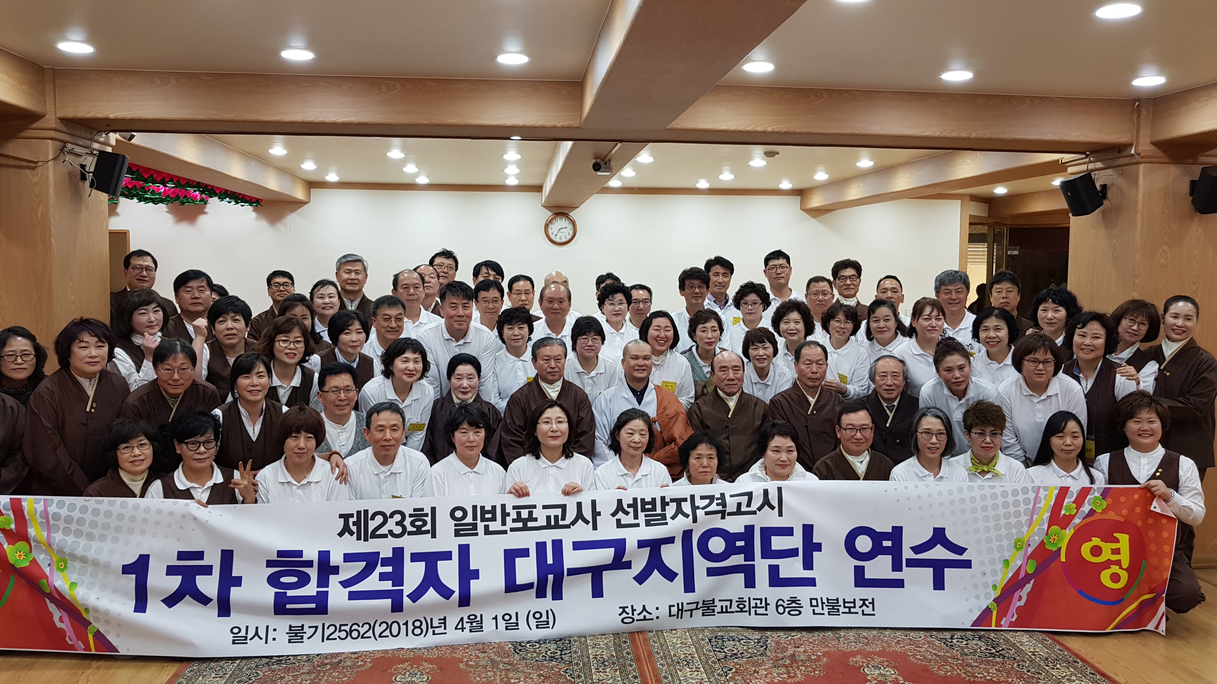 - [부산] 포교원 고시 1차 합격자 불교 문화원 연수교육일시 : 불기 2562년(2018년) 3월24일(토요일) ~ 25일(일요일장소 : 충남공주 불교 문화연수원 부산지역단 (자재천) 정분남 단장님 (도일) 진상근 NGO 본부 총괄팀장부산지역단 1차 합격자 37명 참석3월24일 미 참석자 11명 : 3월31일 ~ 4월1일 교육참석 : 공주 불교 문화원1차 합격자 연수교육집전 및 목탁습의 교육교육을 마치고 부산지역단 단체사진25일 아침 명상 수행자욱한 안개속에서 아침명상 수행을 하고있는 1차 합격자마곡사 대관보전 앞에서 부산지역단 1차 합격자 단체사진 입니다,