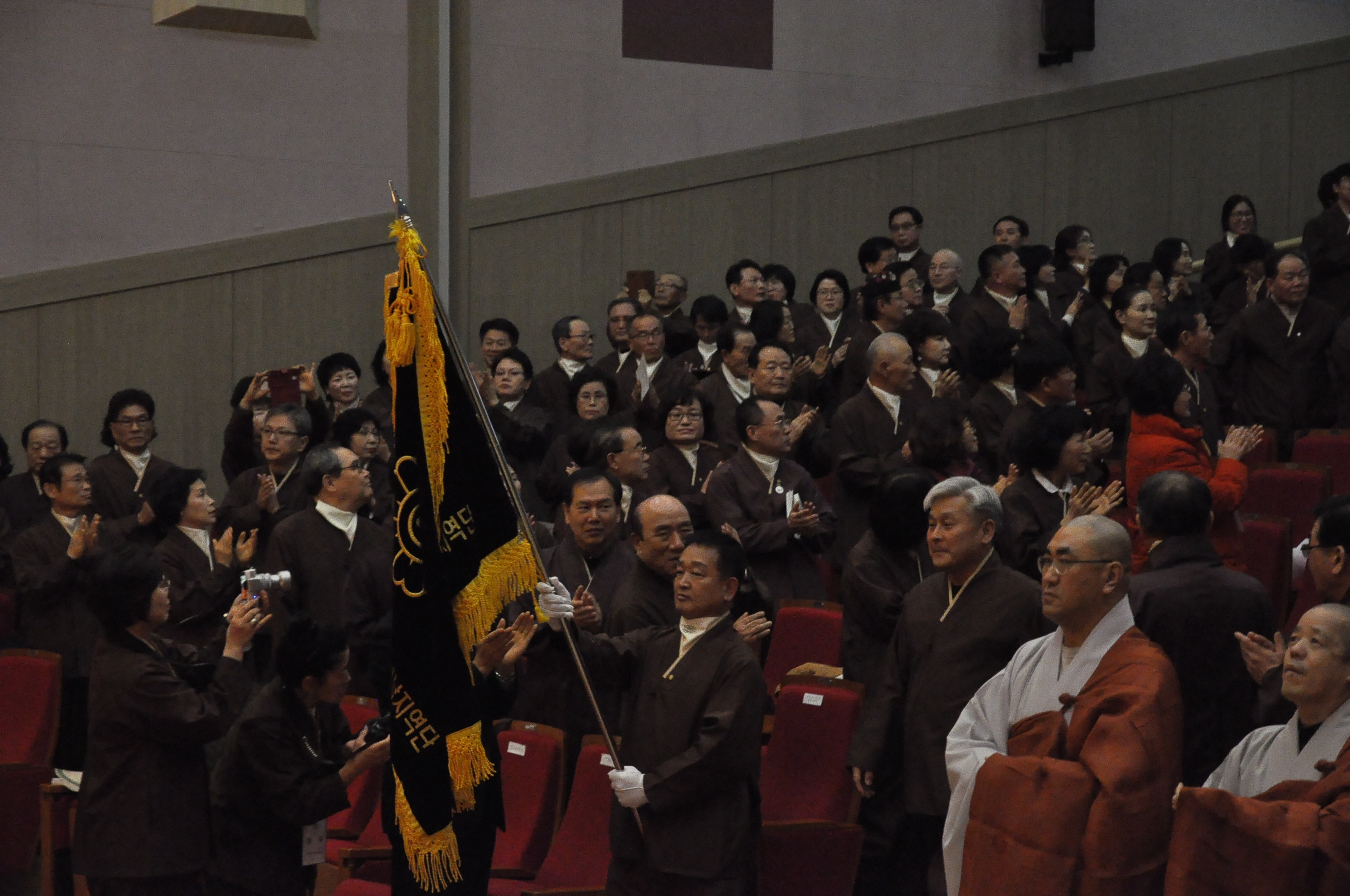 - [포교사단] “삶을 지혜롭게!마음을 자비롭게!세상을 평화롭게!지금 여기 붓다로 살자!아! 신기하고 신기하도다. 어리석음에서 깨어나 보니 사람이 그대로 붓다이네...“ 대한불교조계종 포교원은 ‘붓다로 살자!’ 신행혁신 선언문을 선포하고 포교원장 지홍스님은 윤기중 포교사단장에게 ‘지금 여기! 붓다로 살자!’ 깃발을 전달했다. 포교사단은 불기2562년 3월 11일 15시 ‘포교사단 출범 18주년 및 제5회 포교사의 날 기념법회’를 동국대학교 중강당에서 전국의 대의원 400여 명과 내외귀빈이 참석한 가운데 봉행하였는데, 이 자리에서 붓다로 살자 신행혁신 선언문을 선포한 것이다. 기념법회에 앞서 13시에 2018년 대의원총회가 개최되었는데, 안건1 2017년도 사업결산 승인의 건, 안건2 시민의식개혁대회 및 정기연수 실시의 건, 안건3 행복바라미 사업 시행의 건이 모두 원안대로 결의되었다. 본 행사가 진행되기 전 축하공연에서는 찬불가, 가곡, 민요 등으로 분위기가 한껏 고조되었다. 윤기중 포교사단장은 기념사에서 오늘날 포교사단이 종단제일의 포교단체로 거듭나게 된 것은 종단의 전폭적 지원과 포교사들의 원만하고 완전하며 청정한 전법의 열정과 노력이 있었기 때문이라고 치하하였다. 포교원장 지홍스님은 법어에서 “포교사는 한국불교의 대들보이고 주인공이라고 생각합니다. 올해로 포교사단 18주년이 되었습니다. 한국불교에서는 인간과 그 밖의 모든 존재를 6근, 6경, 6식으로 명시화해 이를 18계라고 합니다. 18세는 미성년자에서 성년으로 되는 것이니 성년이 되는 올해에 신행혁신 ‘붓다로 살자!’를 통해 진정한 18계의 주인공이 되십시오.”라고 말씀하셨다. 이날 행사에는 포교원장 지홍스님, 포교부장 가섭스님, 중앙신도회 정연만 부회장님, 김기병 초대단장을 비롯한 역대 단장들과 현지역단장들, 전국의 대의원들이 참석했다. 영예의 총무원장 상에는 경남지역단의 선행심 이문자 포교사에게 돌아갔고, 포교원장상, 총재상, 포교사단장상 등이 개인과 팀으로 나뉘어 시상되었다.(* 포상자 명단은 첨부파일로 올립니다) 마지막은 이준형 포교사의 지휘로 대구지역단과 서울지역단의 합동 음성공양이 가슴을 뭉클하게 하였다.사진제공 : 서울지역단 수연성 송수옥(홍보팀)