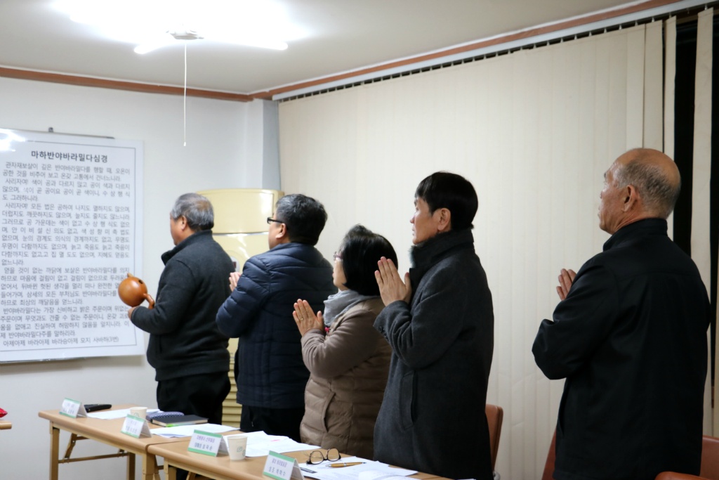 - [대구] 2018년 3차 운영회의가 3월9일(금) 저녁7시 불교회관 6층 만불보전에 있었습니다.수행을 강조하시는 향천단장님의 뜻을 받들어 저녁6시부터 7시까지 직장인들을 위해서 먼저 공양후 7시부터 염불포교팀 팀장님들 집전으로 천수경, 저녁예불(오분향게, 칠정례, 반야심경)성원보고후운영회의를 합니다.삼귀의 반야심경 봉독후 붓다로 살자 발원문 낭독후 개회선언, 의장님 인사로 회의가 시작됩니다.3월에도 단장님께서 3가지의 일화를 소개해주셨으며 포교사는 단복을 입는 순간 또 팀장, 총무,임원 등 소임을 맡는 순간 '어항속의 물고기'처럼 모든 이들이 시야에 들어나게 된다고 하셨습니다. 그리고 오늘의 삶을 되돌아보는 기회로 가져보자고 하셨습니다.활동 경과보고, 부의 안건, 공지사항 사홍서원 후 지역단에서는 참선을 30분 정도 합니다.단장님께서 자세부터 한번 더 알려주시고 지루하지 않게 잘 알려주십니다.이번 달엔 두사람씩 짝지어 '당신은 누구십니까?' 20번씩 질문하고 답하기를 했습니다.나는 누구인가? 한번 더 돌아보는 계기가 되었습니다.