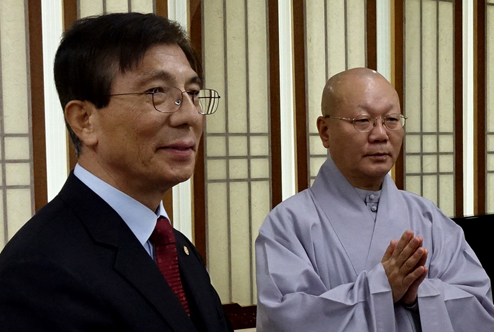 - [포교사단] 조계종 포교원 歲謁(세알) 덕담 풍성대한불교조계종 포교원장 지홍스님께 새해 인사를 드리는 歲謁(세알)모임이 2월 22일(음력 1월 7일) 포교원에서 열렸다. 포교원 원장 지홍스님, 포교부장 가섭스님을 모시고 진행된 신년 세배행사에는 윤기중 포교사단장을 비롯한 포교사단 제10대 집행부 임원들이 전원 참석, ‘황금개구리의 해’라고 전해 내려오는 전통적인 戊戌年(무술년)에 바라는 상서로운 희망과 함께 원융무애한 전법활동을 비는 덕담을 나누었다. 지난 연말에 꾸려져 새롭게 첫발을 내딛는 포교사단 제10대 집행부 임원들로부터 세배를 받고난 포교원장 지홍스님은 인사말에서 “지난 일 년 동안 포교현장에서 묵묵히 노력해준 포교사 여러분께 감사를 드린다” 는 치하과 함께 “새 해에도 더욱 분발하여 좋은 열매를 맺을 얻을 수있도록 건강을 챙겨 나가자” 며 건강이 행복한 삶의 제1덕목임을 일깨워 주었다. 원장 스님은 이어서 “반-탈-무 종교시대라느니, 신자수 급감의 위기라고 걱정하는 사람들이 많은 것이 오늘의 현실이지만, 그럼에도 불구하고 불교의 마지막 버팀목은 재가불자, 특히 포교사여러분들인 것은 확실하다”고 강조하고 “나부터 많은 것을 내려 놓고 타인을 배려하는 보시의 삶이 어떤 것인가를 보여주는 ‘붓다로 살자’ 는 청정한 생활의 수범을 보여주자” 고 강조했다. 포교사단 윤기중 단장은 “모든 것이 어려운 상황속에서도 흔들림 없이 전법활동에 진력해준 포교사 여러분의 노고에 고마움을 전한다”고 말하고 “새해에도 굳은 결기와 열정으로 포교활동에 앞장서자” 고 당부했다. 포교원장실 세알이 끝난후 장소를 옮겨 진행된 포교부장 가섭스님의 《한반도 평화만들기 1000인 은빛순례단》 안내시간에는 이 모임의 에 대한 공지와 동참서명의 시간도 가졌다. 오는 3월 1일(목) 서울 광화문광장 출발을 시작으로 3.1운동 관련 유적지 순례, 서-남-동해안-휴전선 따라 걷기순례와 연찬회 등을 포함하는 이 운동은 ‘기미독립선언 100주년기념일’인 내년(2019년) 3월 1일로 예정된 범국민적 행사인 〈한반도 평화만들기 국민선언〉발표로 1년간의 대 장정을 마치고 회향하는 역사적 행사로 기획된 것임을 설명했다.