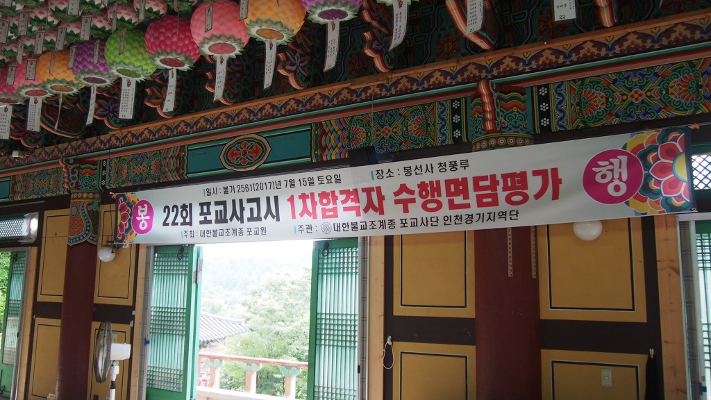- [인천경기] 불기 2561(2017)년 7월 15일 토요일 25교구본사 봉선사에서제 22회 포교사고시 1차합격자 수행면담평가가 실시 되었습니다.무더위와 장마의 날씨로 인하여다소 불편하고 어려움이 있었지만 수행면담평가자 모두 한치의 흐트러짐 없이진행자의 지도에 따라 수행면담이 이뤄지는 가운데천팔십배를 몸소 실천함으로 깊이 있는 수행자의 모습을 보이셨습니다수행면담평가는 기존 연수과정에서 이루어진 내용을 중심으로 이루어졌으며, . 면담과정을 사진에 담아보면서면접관의 질문에 성심껏 답하시는 모습이 좋았습니다개인적의견으로는불제자로써 초심의 자세로 기본에 충실하고자신이 먼저 바른자세로 모범을 보이며 배려한다면 자연스러운 포교로 이루어지는 것이 아닐까!하는 마음을 전해 봅니다우중 무더위속에서 이루어진 행사를 진행하는 운영위원님들과 묵묵히 따라주신 예비포교사님들 모두 존경스러웠습니다 참석하신 모든분께 부처님의 가피력으로 좋은 소식이 전달되시기를 기원드리며... 뜨거운 열기가 가득했던 청풍루의 소식을 올려 봅니다.감사합니다^^