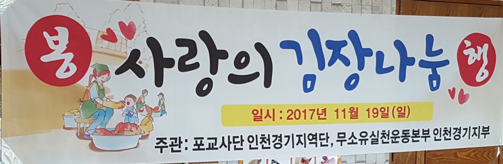 - [인천경기] 포교사단 인천경기지역단(단장 무인 신호승) 북부지역 사랑의 김장 나눔 행사가 불기 2561년 11월 19일 일요일경기도 포천시 관인면 강인숙 포교사 집에서 있었습니다.유난히도 추운날 베품과 나눔이 있는 행사 동참에 신호승 인천경기지역단장님, 이용경 북부지역 총괄팀장, 김창순 일산지역1팀장, 강인숙 의정부지역팀장, 의정부지역 포교사들과 양주시 회천3동 부녀회원들이 수고해 주셨습니다.강인숙 포교사가 손수 농사지은 농작물과 무소유실천운동본부 인천경기지부의 지원,동참해주신 분들의 정성으로 만들어진 맛잇는 김치는 훈훈한마음과 함께 경기도 양주시 회천동지역 저소득층가정과 독거노인에게 전달됩니다.사랑이 가득 담긴 김치드시고 힘내시어 따듯한 겨울 보내시길 바래봅니다.