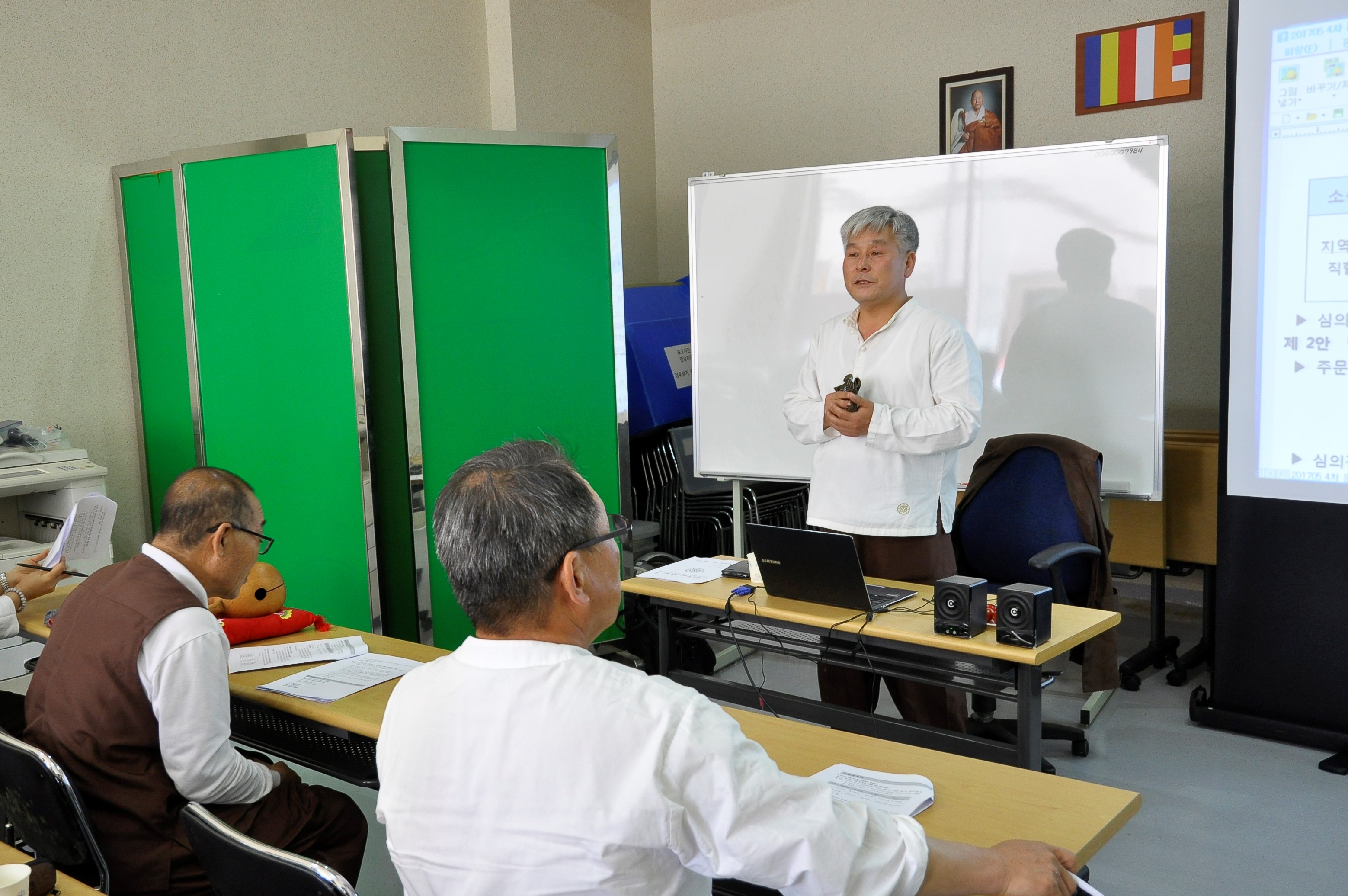 - [대구] 불기2561(2017)년 5월13일(토) 오후2시. 5월13일(수) 저녁7시 두차례에 걸친 2017년 포교사 자격 갱신자 교육이 대구사원주지연합 6층 만불보전에서 있었다.교육입제식의 혜행 박만일 지역단장의 인사말을 시작으로 향천 방창덕 수석 부단장님께서 포교사단의 이해와 자격관리 및 지역별 소양교육이 진행되었다..교육과 함께 향천 수석부단장님의 참선자세와 실참에서 필요한 점들과 중요한 것들에 대한 교육도 함께해 주셨으며 참석한 포교사들은 유익한 시간이었다고 했다.포교사 자격 갱신 교육을 받은 분들은 1년에 한번 전국 포교사들이 다 모이는 팔재계. 1년 한번 재등행렬, 지역단 분야별 연수 세가지를 3년동안 9번 참석해야 하는데 5번을 참석하지 않은 분들에게 하는 교육이다.포교사라면 당연 1년에 3가지 다 한번씩 참석해야 하지만 부득이 다 참석 하지 못하더라도6번 정도는 참석해야 갱신자 교육은 면할것 같다.포교사님들 이왕 마음내어 포교사 하신거 다 사정이 있겠지만 왠만하면 평소에 참석하도록 해봅시다.교육때마다 자리해주신 혜행단장님, 포교사님들 위해 두차례나 교육해주신 향천수석부단장님.자리 챙기고 접수해주신 법경 사무국장님 수고 많이 하셨습니다.