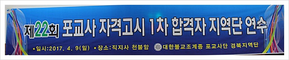 - [경북] 2017. 4.9(일) 10:00 - 18:00 직지사 천불암에서 제22회 포교사고시 1차 합격자 2차 연수가 있었다.1차 합격자 40명중 38명이 참석하였으며 연수 입재식에 이어 지도법사 도신 큰스님의 법문(불자의 기본자세), 지역단 부단장(법융화 이미숙)의 경북지역단 소개, 부단장(청우 강의수)의 지역 연수과정과 평가, 지역단장(지정 이희철)의 포교사의 역할과 자세 및 스피치 이론, 보천 스님의 목탁습의가 있었으며 장궤합장으로 연수생 대표의 발원문 낭독과 도신 큰스님의 회향사로 22기 포교사 2차연수가 마무리 되었다. 지역단 단장(지정 이희철) 인사단장님께서는 교육기간 4개월동안 연수 팀장과 선배들이 연수생들을 보석으로 만들어 주실꺼라고 하셨고 연수생은 지역단 선물이라고 하셨다. 지역단 출범이후 첫 포교사를 배출하게 되어 기쁘고 교육기간동안 교육팀장, 선배 포교사들과 서로 힘을 합쳐 무사히 연수를 마치기 바란다며 연수생들과 함께 화이팅을 외쳤다.지도법사 도신 큰스님 법문먼저 도신 큰스님께서는 성대수술로 목소리가 정상적으로 나오지 않는다고 양해해 달라는 말씀과 더불어 불자의 기본자세에 대한 법문을 하셨다.1.인연법에는 혈연, 학연 등등이 있는데, 그 중에 가장 좋은 인연이 부처님과의 인연이고 그 다음은 도반연이라고 하셨다. 도반을 잘 만나면 불법을 반이나 이룬 것과 마찬가지라고 하셨다. 2.선업을 잘 쌓으려면 몸과 마음을 청정하게 해서 수행하고 복되게 살려고 노력해야 한다고 하셨다.3.불자는 교리를 많이 안다고 해서 불자가 아니고 부처님 말씀을 행하여 이웃들에게 행복을 나눠줘야 진정한 불자라고 하셨다.4.불자의 자세는 부처님이 되는 그 날까지 항상 자신이 부족하다고 생각하고 부처님 말씀을 행하고 배워가는 포교사가 되어야 한다고 하셨다.