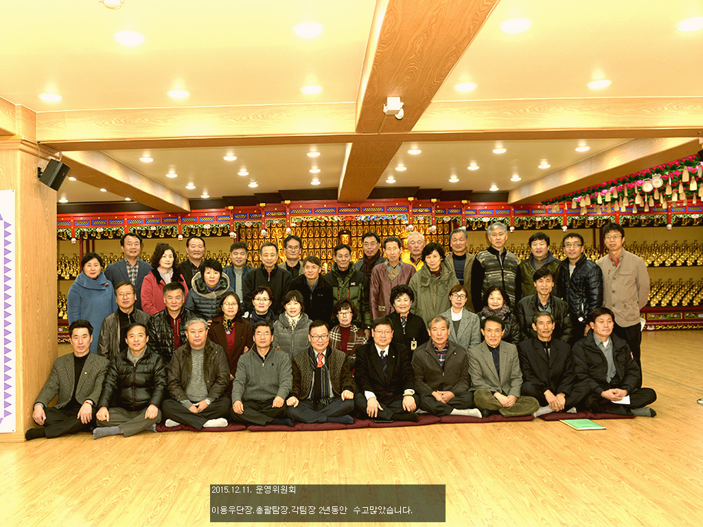 - [대구] 불기2559(2015)년 12월11일대구,경북지역단 불교회관6층 만불보전에서 여광이용우지역단장. 총괄팀장. 각팀장 마지막 운영회의 봉행하였다. 단장님인사 2년동안 각 팀원 많은 협조와 도움으로 무사히 보냅다고 하셨다. 부단장님도 한 말씀씩 있었다. 사무국장님 내년도 예산집행과 행사일정 소개로 마무리 하였다. 2년동안 총괄팀장 각팀장님 맡은 책임과 봉사로 수고했습니다. 홍보전략팀장 법계성 노영이합장