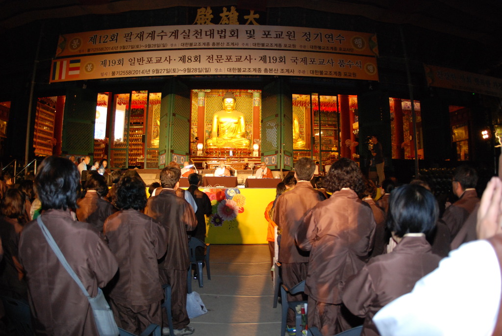 - [포교사단] 제12회 팔재계수계실천대법회 및 만인동참 ‘붓다로 살자’ 선언 - 하루 낮 하룻밤만이라도 청정한 우바이 우바새가 되겠습니다. 기사 : 서울지역단 수연성 송수옥 사진 : 서울지역단 자운 홍상기 서울지역단 반야지 조성미 불기2558년 9월27일 오후 5시.대한불교조계종 포교원 주최, 대한불교포교사단 주관으로 제12회 팔재계수계법회가 국화향기 물씬 풍기는 조계사 대웅전 앞마당에서 거행됐다. 이날 법회는, 대한불교조계종 총무원장 자승스님, 포교원장 지원스님, 포교부장 송묵 스님, 포교국장 노휴스님, 조계사주지 원명스님, 법주사 , 선본사, , 송광사, 봉선사, 용주사, 주지스님, 각 지역단 지도법사 스님 곽명희 단장, 정목희 서울지역단장, 외 전 단장, 12개 지역단 포교사, 가족 등 사부대중 1만 여명이 동참했다. 법회는 대의원 총회. 식전행사, 저녁예불, 오후불식, 입재식, 단기입장, 삼귀의, 반야심경, 포교사의 노래, 내빈소개, 인사말 , 환영사, 포상, 축가, 품수식, 붓다로 살자 선언 및 특강, 8재계수계식, 철야정진, 촛불행진, 새벽예불, 보살계 수계식, 회향식, 사홍서원, 기념촬영 순으로 진행되었다. 전통문화 예술공연장에서 대의원총회가 열리는 동안 식전행사로 전통문화상설공연 강릉 관노가면극이 공연됐다. 곽명희 단장은 인사말에서, 종단의 어르신 자승스님과 관련자 스님들께 감사인사를 드린다며, 올해 품수를 받는 포교사들에게 축하의 말을 전했다 . 또한 단장은, "오늘과 내일 하루 동안 출가자가 되어 마음자리를 밝히는 팔관재계와 보살계를 수지하게 된다". 지식으로만 할 수 없는 것이기에 수행정진을 통하여 부동의 계체를 이루고 지속적인 지계실천운동으로 이 사회 모든 분들이 행복해 지는 "부처님의 전도선언" 이 이 땅위에 꽃피우게 하여야 할 것이라고 강조했다. 조계사주지 원명스님은 환영사에서, 전국 포교사들이 포교중심도량인 조계사에 온 것을 환영 한다 "계를 받는데 많은 제약이 따랐던 생활에서 하루 만 이라도 팔재계를 지켜 부처님의 가르침에 일심으로 귀의하겠다는 서원을 빌어 마련한 자리다". 또한 포교사로서 부처님의 법을 수호하고 헌신 하겠다는 원력으로 부처님의 계를 수하는 공덕만으로도 복과 지혜를 얻어 사회구성원 모두가 행복하게 살아 갈 것이다. 아함경에 "오계를 일생동안 지키는 것 보다 팔재계를 단 하루에 지키는 것이 수승하다" 라며 팔재계의 의미를 설했다. 자승스님은 법문에서, 올해로 12년째 팔재계를 해오고 있는데 포교원장스님이 취임 후 전국에 흩어진 포교사들을 모아서 지난해부터 체계적으로 활성화 시키고 있다. "내년에는 5만 불자가 광화문에서 열릴 불교 대법회를 준비하고 있다""며, "불교를 바꾸는데 스님들의 역할도 중요하지만 포교사들의 원동력이 크다고 강조하며" 1박2일 동안 배우고 느끼는 기도가 되길 바란다고 격려 했다. 이어 일반포교사 784명, 전문포교사 79명, 국제포교사 28명, 상담심리사 21명이 품수와 단복을 수여받고 부처님 전도 선언과 결의문을 낭독했다. 일반포교사 최고령 합격자는 송택규(85) 씨, 최연소 합격자는 홍현승(23) 씨다. 이밖에 대전충남지역단 여갑동ㆍ황경옥 씨, 충북지역단 임병국ㆍ최경숙 씨 등 부부합격자도 배출됐다. 지원스님은 법문에서, 부처님10대 제자 중 전법 제일의 부르나존자는 최초의 불교순교자였다. 전법 의지가 적극적이고 누구보다도 뛰어났으며, 전법을 위해선 그 어떠한 박해나 목숨을 두려워하지 않고 오히려 영광 이라고 생각했다, 며 "위법망구의 투철한 정신으로 불교포교에 나서달라고 당부했다. 아울러 종단 차원에서 전개되고 있는 ‘붓다로 살자’ 운동에 동참하겠다고 선언하는 자리도 마련됐다. 초대단장이었던 김기병 포교사를 대표로 ‘붓다로 살자’ 선언문을 낭독하고, 이어 도법스님이 곽명희 단장에게 감사패와 종정스님 친필휘호(붓다로 살자)를 수여하고 "붓다로 살자"특강을 했다. 포교원장 지원스님을 전계화상, 포교부장 송묵 스님을 교수사, 조계사 주지 원명스님을 갈마사 팔재계 수계식을 진행했다. * 지난 옛적 내가 지은 모든 죄업 참회 합니다. * 몸과 맘과 뜻으로 지은 죄 부처님 앞에 참회 합니다. * 하루 낮 하루 밤 이라도 청정한 우바이 우바새가 되겠습니다. 28일 12시, 경견하고 굳건한 마음으로 8재계 수계를 받은 참가자들은 누구하나 흐트러짐 없이 촛불을 하나씩 들고 관세음보살 정근을 하며 청계천 물길을 따라 돌아 장엄하고 아름다운 행진을 마쳤다. 새벽예불을 마친 후 하루 출가가 끝나고 다시 보살로 돌아가는 보살계 수계식을 마치고 기념촬영을 끝으로 팔재계를 원만 회향했다. '붓다로 살자' 선언문 조계종 총본산 조계사 앞마당에 모인 포교사들은 간절히 손 모아 가슴에 새깁니다. 중생의 아픔을 내 아픔으로 여겨 한순간도 겸허와 행복의 길로 이끌었던 붓다의 고귀한 삶과 정신을 따라 지금 여기에서 거룩한 붓다로 살겠습니다. 붓다처럼 자연과 사람을 고귀하게 맞이하여 말하고 행동하겠습니다. 진실하게 말하고 행동 하겠습니다. 겸허하게 맞이하여 말하고 행동 하겠습니다. 평등하게 맞이하여 말하고 행동 하겠습