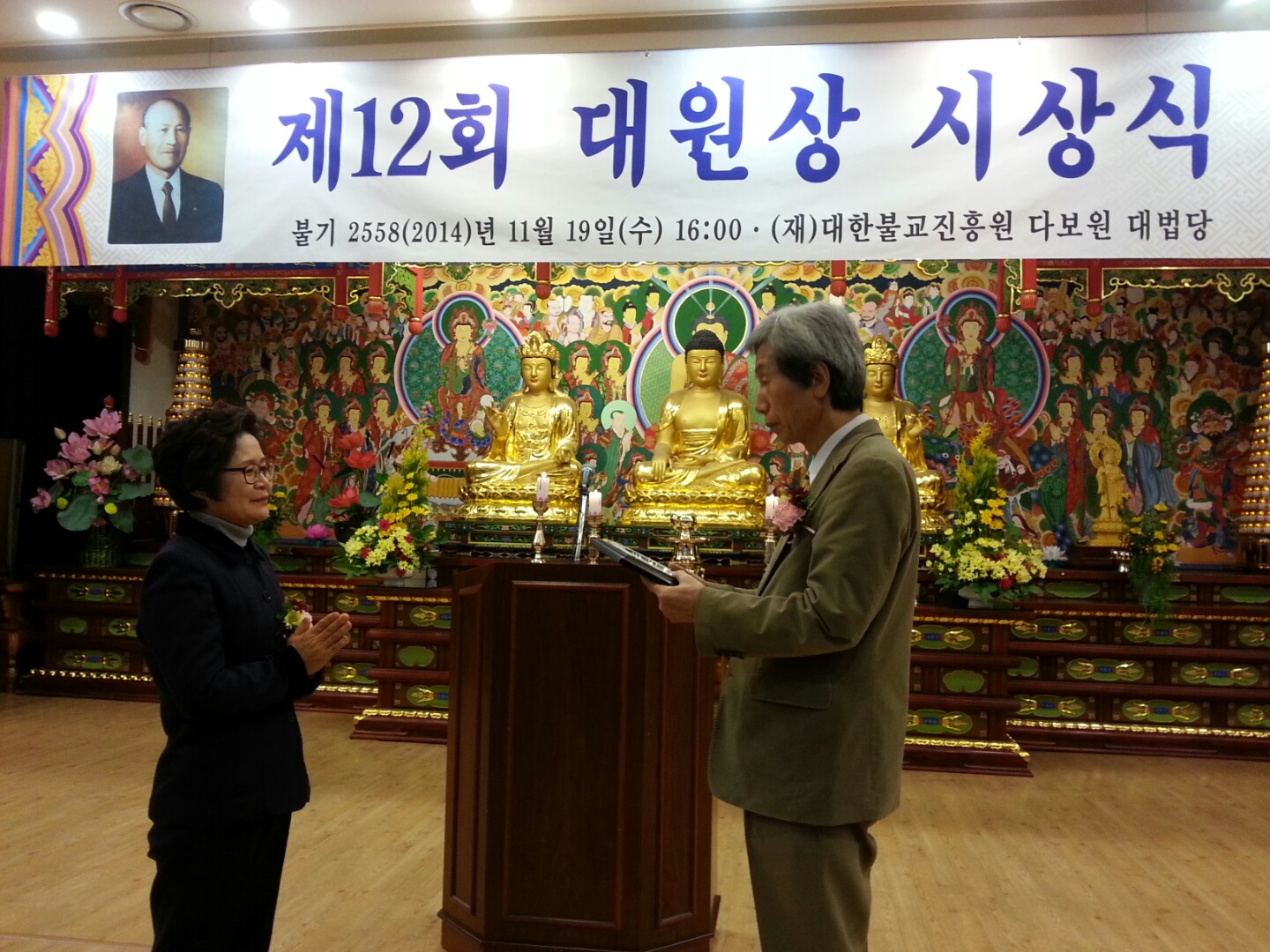 - [포교사단] 2014년 11월 19일(수) 오후4시, 다보빌딩(불교방송) 3층 법당에서 제12회 대원상 수상식이 있었다.대한불교조계종 포교사단은 출범 이후 꾸준히 활동해온 전국 포교사들의 노고에 힘입어 특별상을 수상하였다.대원상은 재단법인 대한불교진흥원에서 매년 세상을 위한 불교라는 기치 하에 21세기 현대사회에 적합한 불교정신과 사상의 보급과 전파를 위하여 모범적으로 정진하고 있는 개인 및 단체를 선정하여 시상하는 상이다. 수상내역 1. 출가 부문 대상 : 정련 스님(사회복지법인 내원 이사장) 특별상 : 해성 스님(사회복지법인 연화원 이사장)2. 재가 부문 대상 : 금강경독송회(지도법사 : 김재웅) 특별상 : 대한불교조계종 포교사단(단장 : 곽명희) 장려상 : 불교영어도서관(관장 : 정지원)******콘텐츠대상 : 수상작 없음. 특별상 : 송혜진(가족 음악극 ‘부처님, 용궁 가시다’) 장려상 : 동국대 영상문화콘텐츠연구원(원장 : 이종대) [모바일 앱 '용궁에서 온 보물'] 장려상 : 양경수(웹툰 ‘부처님의 10대 제자’ 외)