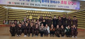 - [대전충남] 2024년 1월20일(토) 충남 공주시 신간동 476-1 소재 마곡사 불교대학에서 마곡사 불교대학생과 저희 지역단 포교사님들. 그리고 일반인들이 모여 최근 유튜브에서 로 유명한 광우스님(서울 강북구 화계사 교무스님이셨고 현재 계룡 원오사에 계십니다)의 법문을 청해 들었습니다. 스님의 법문은 청중들을 웃기셨다 울리셨다를 하셨고 진한 감동이 있으셨으며 스님의 법문명성이 헛된것이 아니었음을 알게 된 소중한 시간이었습니다. 법문을 요약하면 (광우스님이 요약해 주심) 1. 매일 매일 간절함을 가지고 최소 1시간 이상 기도를 하십시요. (관세음보살기도든 기장보살 기도 등에 따른 영험은 없으며, 기도하는 이의 간절함을 갖고 꾸준히 기도함) 2. 복을 짓는 일을 하십시요. 그 첫째가 보시입니다 물 한방울이라도 보시하는 마음으로 보시를 해 세상에 이로움이 되게 하는데 기여하십시요 였습니다. 여러 사례와 영험한 체험 이야기를 통해 법문을 듣는 사부대중들에게 소중한 가르침이 되었습니다. 한편 이날 법문을 함께 들은 저희 지역단 포교사, 마곡사 불교대학생 외 사부대중은 광우스님을 모시고 기념촬영을 하였으며 불교대학생들에게는 별도의 시간을 내서 지역단 정수 최종대 단장님의 포교사에 대한 설명회가 있었습니다.