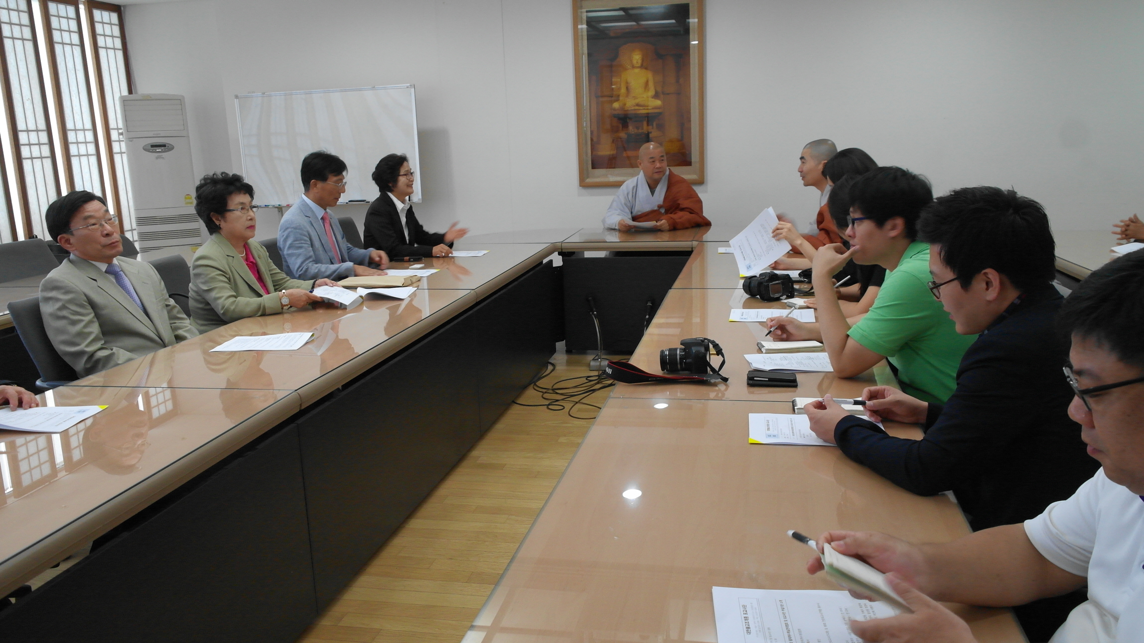 - [포교사단] 불기2558년 9월 24일(수) 오전 11시 포교사단 교육관에서 팔재계를 앞두고 사무처 및 전문운영위원 서울지역단 임원 연석회의를 열었다. 본단 곽명희 단장과 윤기중 수석부단장 및 3명의 부단장들과 전문운영위원 8명과 서울지역단 정목희단장을 위시한 지역단 임원, 사무처 직원이 함께해서 팔재계 준비사항 진행사항 및 담당자별 임무를 점검했다 곽명희 단장이 직접 팔재계 전체 행사진행과정을 시작부터 끝까지 하나하나 설명하고 담당자별 분장된 임무와 진행내용 및 그동안 준비사항을 점검하여 참석자 모두가 함께 공유하는 자리가 되었다.