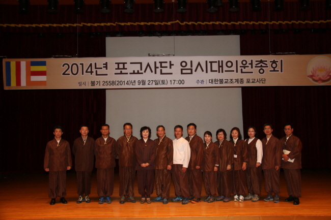 - [포교사단] 불기2558년 임시대의원총회 - 새로운 포교사단 시대 서막을 열 것을 결의 27일 오후 서울 종로구 조계사 대웅전 앞에서 제12회 팔재계수계실천대법회 식전행사로 전통문예공연팀이 세계유네스코 등록 무형문화재 제13호 강릉관노가면극을 관람하고 있는 시간, 불교역사문화회관 지하 공연장에서는 임시대의원총회가 열렸다 윤기중 수석부단장 사회로 진행된 회의는 삼귀의와 반야심경에 이어 단장 인사, 포교부장 송묵스님 격려사, 전 회의결과 및 활동 보고, 안건 심사 및 공지사항 순으로 진행 되었다 곽명희 단장은 인사말에서 “그 동안 팔재계행사 준비에 여념이 없이 지내온 대의원님들의 노고에 감사드린다.”면서 “오늘 행사는 종단과 교계 및 사회와 언론의 이목이 몰려있는 시기인 만큼 우리가 포교사의 위상과 정체성을 스스로 확립하는 기회로 삼자”고 했다. 이어 포교원 포교부장 송묵스님이 격려차 참석하여 “오늘 우리 사회는 부처님의 법을 전하는데 포교사님들의 신념과 용기를 필요로 하는 시기다.” “신념이 필요한 것은 우리가 부처님 법을 믿음으로서 행복하고, 우리가 부처님 법을 전함으로서 모든 사람이 행복하고 아름다운 삶을 살아갈 수 있도록 우리가 한다는 자긍심을 가져야 하며, 용기가 필요한 것은 자신의 이익을 추구하는 것이 아니라 모든 사람이 행복하고 항상 보람되게 실 수 있도록 내가 나 자신을 희생해가며 포교를 행한다는 것이다“면서 ”여러분들의 말이나 행동 하나하나가 재가불자들의 귀감이 되는 만큼 여러분들이 한 마음으로 우리 사회가 불국정토가 되는 그날까지 불퇴전의 용기와 신념을 갖고 노력해 줄 것“을 당부했다 이어 전 회의결과와 상반기 감사결과 및 활동 보고를 마친 다음 본안 심사에 들어가 제1호, 포교회관 매입 제2호, 불기 2015년도 예산(안) 선집행 승인의 2개 안건을 심의하고, 모두 원안을 승인했다 특히 이번 ‘포교회관 매입 추진’ 결의 의미에 대해 집행부는 포교회관건립을 위한 포교사님들이 기울인 노력의 결실이며, 포교사단의 정체성과 자주성을 확립하고 새로운 포교시대를 여는 전환점이 될 것으로 기대하고 있다 회의는 공지사항에 이어 사홍서원을 끝으로 원만회향했다.