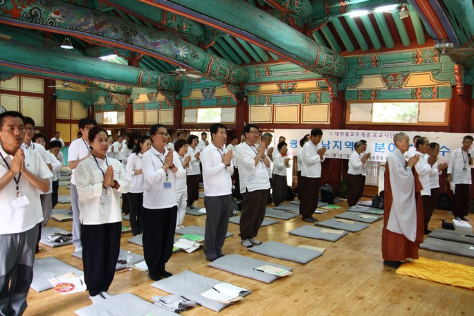 - [광주전남] 광주전남지역단 분야별 연수 및 1차 합격자 면담평가 불기2558년 7월 5일 오후 3시30분부터 6일 오전 8시30분까지 승보종찰 조계총림 송광사에서 광주전남지역단 포교사 101명과 포교사고시 19회 1차합격자 41명이 참석한 가운데 분야별 연수와 1차합격자 최종면담 평가가 있었다. 이날 입재식은 삼귀의, 찬불가, 반야심경, 지역단 활동영상, 지역단장상 시상, 각안스님의 격려사와 김정연단장의 인사말 그리고 윤중근수석부단장과 김진희포교사의 포교사의 다짐 선창에 이어 19회 포고사고시 1차 합격자 손덕임법우의 발원문 낭독, 사홍서원으로 진행되었다. 광주전남지역단 선철 김정연단장은 분야별 연수을 통해 포교에 대한 정책과 비젼을 세우고 우수팀별 사례발표 시간을 가짐으로써 우리 지역단을 이해하고 포교사의 긍지를 듬뿍담아 불법홍포에 의뜸가는 광주전남지역단이 될 수 있도록 다함께 노력하자 하였다. 광주전남포교사단 지도위원 각안스님(송광사 포교국장)은 격려사에서 참석한 우리 지역단 포교사들에게 1박2일의 연수시간 동안 송광사에서도 안거결제 수행기간인 만큼 각자가 신심, 내 마음속에 부처의 성품이 있음을 되새기고 나아가 지역단이 화합하고 단합되는 시간이 되길 바란다 하셨다. 입재식이 끝나고 저녁공양 전까지 송광사 광원암 현봉스님의 초청법문과 각안스님의 ‘지역전법네트워크 구축방안’ 주제로 강의가 이어졌다. 본격적인 분야별 연수는 저녁 공양과 예불 이후 새로이 갖추어진 템플스테이관에서 중앙단 강동희 전문운영위원의 포교사단의 정책과 비전 강의, 각안스님의 불교의식 강의, 1차합격자 면담평가, 3분 스피치, 우수팀 사례발표와 자유토론 등으로 자정을 넘어 1시45분경까지 진행되었으며, 3시까지 휴식 및 개인기도 시간을 가졌다. 새벽예불은 아침종성과 웅장한 불전사물 울림으로 시작하여 오분향례, 팔정례, 발원문, 한글반야심경 그리고 금강경 제14 이상적멸분까지 봉독하였으며, 이후 광주전남지역단원은 108배를 모두 함께 하였다. 아침공양 후 여진 김광수포교사의 송광사 사찰문화해설이 있었으며 8시 회향식으로 모든 일정을 마쳤다.