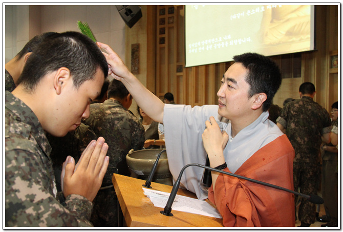 - [서울] 포교사고시 제19회 1차 합격자 군포교 연수교육 (상승사) 불기2558년 (2014) 6월29일 일요일 오전10시 경기도 파주 소재 9사단 상승사에서 포교사고시 제19회 1차 합격자 (서울지역단) 군포교 연수교육이 있었다. 삼귀의와 한글 반야심경으로 시작된 이날 행사는 서부 군2팀 우파 여한균팀장의 지휘아래 일사분란하게 진행되었으며 반야정 이선재 포교사의 집전과 황구연 포교사의 설법 순으로 이루어졌다. 이날 행사에는 서울지역단 법천 장봉수 부단장과 법용화 한애경 부단장. 포교지원본부 혜등 이주영 총괄팀장. 서부지역본부 자광 윤광식 총괄팀장. 우파 여한균팀장. 9조 효광 여원태 교육팀장. 10조 법공 이은갑 교육팀장. 반야정 이선재 포교사. 조용우 포교사. 김지아 포교사가 참석하였다. 특히 이 날 법회에는 19회 1차 합격자 군포교 연수교육의 마지막날로 20명의 1차 합격자와 110여명의 평소보다 많은 군장병이 자리를 함께 하였으며 19회 1차 합격자들은 군장병들의 법회순서와 설법의 자세 그리고 진행과정등을 시종 진지한 분위기속에 차분한 자세로 연수교육에 임했다. 사진촬영 / 혜등 이주영 취재 / 홍보팀 법용화 한애경