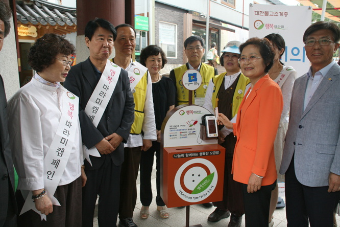 - [서울] 행복바람 전국으로 확산 '"사회 공헌 활동의 새로운 길벗, 전통문화 나눔문화로 어우러진 ,2014년 대한민국 행복바라미 문화대축전의 출발을 선포 합니다." 불기 2558년(2014) 6월20일 오후7시 서울광화문 광장에서 열린 '행복바라미 문화대축전" 알림식'에서 김희옥 동국대 총장은 거리모금 캠페인의 시작을 알렸다. 사단법인 날마다 좋은날(이사장 이기흥)은 6월19~20일 열린 행복바라미 문화대축전은 자비문화의 확산을 위한 거리 모금의 캠페인이자 전통문화와 나눔문화가 어우러지는 새로운 문화축제의 장으로 열렸다. 이날 행사에는 포교원장 지원스님, 이기흥 날마다 좋은날 이사장, 총무부장 정안스님, 조계사주지 원명스님, 도선사주지 도서스님, 박원순 서울시장, 김희옥 동국대 총장, 포교사단 서울지역 정목희 단장, 서울지역포교사 등 사부대중 1천여 명이 참석했다. 행복바라미 문화대축전은 세월호 실종자 12명의 귀환을 기원하는 노란손수건 달기를 시작으로, 조계종포교원장 지원스님, 이기흥날마다 좋은날 이사장 외 내빈들은 신용카드로 기부를 하는 행복바라미 단말기를 시연하며 동참에 호소했다. 조계종총무원장 자승스님은 총무부장 정안스님이 대독한 치사를 총해, "작은 몸짓과 발걸음으로 세상의 변화는 시작되는 만큼 당장의 성과나 변화가 없더라도 지속적으로 추진해 나가야 한다" 면서 "공업중생으로 행복을 나눠 우리 모두가 향기롭길 기원한다" 고 당부했다. 박원순 서울시장은 축사에서, '조계사에서 세월호 참사로 희생자의 넋을 추모제를 열어주는 등 "불교계가 국가적 슬픔에 치유와 위로의 등불이 돼 주고 있다"며 "아울러 서울시와 함께 경복궁과 조계사, 인사동을 잇는 역사문화관광지원 조성사업, 신재생에너지 확산을 추진하고 있다" 앞으로도 불교계와 서울시가 호흡을 맞춰 많은 일을 할 수 있길 소망한다."고 강조했다 이기흥 날마다 좋은날 이사장은, 환영사에서 '행복바라미의 자비와 참여정신을 우리 사회에 더욱 확산함으로서 나와 너, 어려운 이와 돕는 이, 모두가 행복의 가치를 함께 실현하는 좋은 벗이 되길 다짐 한다"면서 "2년차인 행복바라미 문화대축전이 우리 사회에 비관과 절망이 아닌 낙관과 희망의 행복바람을 일으키도록 함께 노력해 나가자고 서원했다. 이어 사부대중은 조계종 전교육원장 청화스님의 축시 "나누는 손바닥"'을 함께 낭독하고 행복바라미 로고송을 불렀다. 저녁8시부터 승무, 바라춤, 난타, 인디밴드의 축하공연 애니메이션 "붓다"가 상영됐다. 행복바라미 홍보대사로는 (소트트랙 공상정, 심석희, 조해리선수, 수영 정다래 선수 노인상 전 수영감독) 사인회,전통문화 전시 및 체험 등 다양한 프로그램을 통해 전통문화의 우수성과 자비나눔분위기의 확산을 유도했다. 특히 나눔문화켐페인은 6월21일부터 7월5일까지 전국16개 시도 108곳에서 모금함을 설치하고 대규모 거리모연을 펼친다. 이 기간 동안 지역 행사로 △수원 팔달구 지동교(6월22일) △대전 은행동 으능정이 문화의 거리(6월28일) △광주역 광장(6월29일) △대구 동성로 대구백화점 앞(7월5일) △부산 광복로 패션거리(7월6일) 등 지역 랜드마크에서 켐페인을 펼친다. 모연된 수익금은 우리사회 구석구석 소외 진 이웃들, 무의탁 노인과 청소년 빈곤 이주민 등 에게 쓰일 예정이다. 글/ 사진 홍보팀 수연성 송수옥