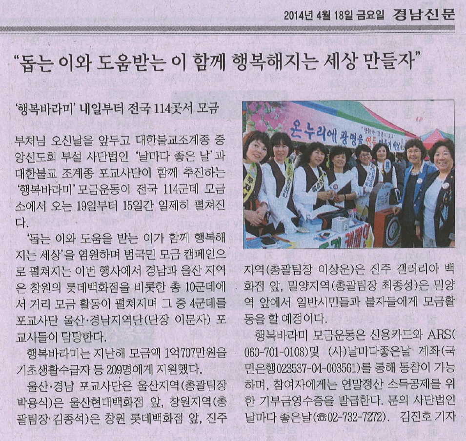 - [경남] 행복바라미 모금 캠페인 관련 기사가 2014년 4월 18일 경남의 대표신문인 경남신문 16면에 게재되었다. 섭외는 창원총괄팀장 청해 김종석 포교사님이 수고해주셨고, 보도자료는 울산경남지 역단 홍보전략팀에서 제공하였다. 불기2558(2014)년 4월 18일 혜안 합장