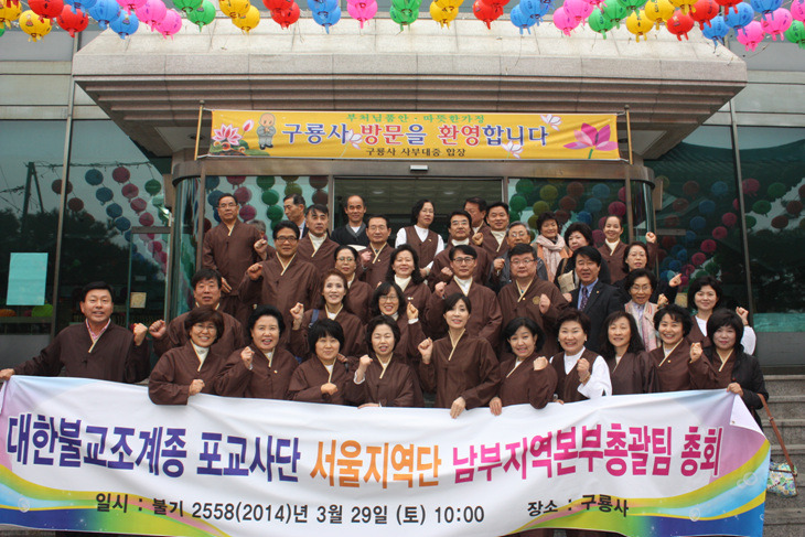 - [서울] 남부지역 본부 총괄팀 총회 및 홍보팀 워크샵 불기 2558년(2014) 3월 29일 토요일 오전 10시부터 오후 4시30분까지 양재동 구룡사 1층 회관에서 남부지역본부총괄팀 총회 및 홍보팀 워크삽이 열렸다. 이날 행사에는 군종교구장 구룡사 회주 정우 스님, 포교국장 노휴 스님, 서울지역단 법용화 한애경 부단장. 법천 장봉수 부단장. 남부총괄팀장 혜운 이현철, 직할포교본부총괄팀장 자홍 맹도형, 감사 혜광 양원식. 각 팀장님들과 포교사들이 참가했다. 삼귀의례와 반야심경 그리고 법용화 한애경 부단장의 거룩하신 부처님께 진실한 믿음으로 귀의합니다를 시작으로 한 인사말에 이어 혜운 이현철 남부총괄팀장의 인사말과 포교국장 노휴스님의 법문으로 이어졌다. 노휴 스님은 법문에서 “부처님이 우리에게 주시는 최고의 공양은 미소”라며 “그 모습에 우리는 교화된다”고 말씀하셨다. 더불어 “부처님께는 생로병사를 해결하기 위해 출가하셔서 6년 고행 후 성불하셔서 행복해지는 방법을 찾으셨으며, 어떤분은 내일 아침 소풍가는 기분으로 잠을 자야 행복함을 느낄 수 있다”며 “행복은 첫째는 내가 행복해지고, 두 번째는 남을 행복하게 만드는 것임을 알고 행복하게 살라”고 강조했다. 이어서 한애경 부단장의 서울지역단 임원소개 및 팀장소개등 서울지역단의 조직도에 대한 자세한 설명으로 이어졌다. ‘북녘 어린이를 위한 자비나눔 걷기대회’가 파주 임진각에서 동시에 열려 지역 단장을 비롯한 많은 포교사들이 참석하지 못했지만 군종교구장이시며 구룡사 회주 정우 스님은 한달전에 서울지역단 남부총괄팀과의 법문 약속을 지키기 위하여 모든 일정을 취소하시고 남부총괄팀 총회의 오후 행사에 참가해 자리를 빛내 주셨다. 정우 스님은 “군종교구장으로 재임 중에 군포교 발전을 위해 매진할 것”이라며 “부처님을 ‘당신’이나 ‘님’ 등으로 표현한 군법회의 발원문과 책자등을 수정하기 위해 힘쓰겠다”고 말씀하셨으며 이를 위해 포교사들의 역량이 필요하다”고 하시며 포교사님들도 노력해달라고 당부하셨다. 구룡사에서 준비한 맛있는 점심공양에 이어 한시간동안 이어진 정우스님의 법문이 있었으며 이어서 5층 열반전으로 이동해서 남부지역포교팀 이기호 팀장의 집전으로 금강경 기도 독송이 있었다. 이현철 포교사의 사회로 진행된 이날 행사는 남부 구자명 팀장, 최정숙 팀장, 이지숙 팀장, 이기호 팀장과 양영미총무등의 홍보팀원 그리고 박계영 팀장, 이혜숙 팀장, 박윤재 팀장, 여원태 팀장, 이은갑 팀장과 우진숙 포교사, 최순심 포교사, 김승길 포교사등 총 53명의 포교사가 참석하였으며 각 팀별 미팅 후 발표 등의 시간으로 이날의 모든 일정을 여법하게 마쳤다. 사진협찬 / 홍보팀 수연성 송수옥 취재 / 홍보팀 보광화 김현숙
