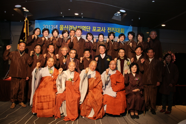 - [경남] 대한불교조계종 포교사단 울산경남지역단장 (선행심 이문자)은 불기 2557년(2013) 12월 14일 (토) 17:30부터 22:00까지 창원 풀만 앰배서드 호텔 로터스홀에서 2013년 울산경남지역단 포교사 전진대회 및 12월 정기운영위원회의를 다음과 같이 봉행했다. 제1부는 울산경남지역단 지난 2년간 포교활동 영상을 혜안 강 신 포교사 해설로 진행 시청하였으며, 제2부는 개회선언, 삼귀의, 한글반야심경, 포교사의 다짐, 지역단 발자취, 내빈 및 임원 소개, 환영사, 축사, 청법가, 법문, 포교사 전진대회 포상 및 공로패 수여, 포교사의 노래, 공지사항, 사홍서원순으로 마무리하였고, 특히, 통도사 부주지 재원 큰스님, 울산시 정토사 주지/ 울산시 사암연합회장 덕진 큰스님, 포교원 신도국장 덕산 스님, 통도사 포교국장 울산경남지역단 지도법사 선본 스님, 포교사단 부단장 심재덕, 포교사단 부산지역단장 강수대, 대구경북지역단장 장한상, 포교원 행정관 박맹수께서 참석 자리를 빛내주시고 원력을 갖고 포교활동 할 수 있는 격려와 성원을 아끼지 않았다. 제3부는 저녁공양, 축하케이크 커팅, 포교사 노래 및 장기자랑, 축하공연(꿈앤꾼 악단), 행운권 추첨, 최다 참석팀 포상으로 원만하게 회향했으며, 이어서 2013년 12월 정기운영위원회를 제8대 운영위원 임명외 1건, 기타토의, 공지사항 등 강행군이 끝났다. 사진/글 : 대한불교조계종포교사단 울산경남지역단 자원봉사행원팀 중앙홍보위원 덕산 이승선
