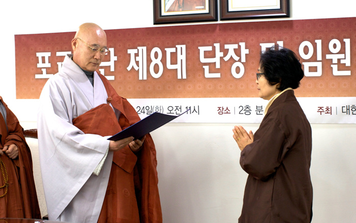 - [포교사단] 곽명희 포교사단 단장과 지역단장 등 임원 임명으로 조계종 제8대 포교사단이 출범했다. 포교원(원장 지원스님)은 12월24일 11:00 서울 종로구 견지동 한국불교역사문화기념관 2층 종회분과회의실에서 포교사단 제8대 단장 및 임원 임명장 수여식을 개최하였다. 이날 포교원은 곽명희 8대 포교사단장을 비롯해 윤기중 수석부단장, 권영익, 최은자, 장용숙 부단장, 감사 이정태, 지역단장에는 서울 정목희, 부산 강수대, 대전충남 조명숙, 광주전남 김정연, 대구경북 이용우, 전북 주정기, 강원 이주진, 충북 김임중, 인천경기 김기호, 울산경남 이문자 등 16명에게 임명장을 수여했다. 각 임원들에게 일일이 임명장을 전달한 포교사단 총재 지원 스님은 곽명희 포교사단장에게 포교사단기를 전했다. 지원 스님은 “여러분들의 존재를 알게 한 종단과 가정, 사회 및 사찰에서 항상 주인으로 불자임을 자랑스럽게 여기라”며 “21세기 보살의 삶을 실천해 불교가 널리 전해지는 세상을 밝히는 등불이 되어 달라”고 격려했다. 이에 곽명희(문수행) 포교사단장은 “오늘은 포교사단호의 순항을 위하여 key를 받았습니다. 그 배에 선장, 항해사, 기관장의 역할을 저희들이 해야 하며, 손님으로 모실 5천여 포교사를 비롯한 불자들을 안전하게 모실 것을 지도위원 스님들이 계시는 이 자리에서 약속드리겠습니다.”고 강조했다. 곽명희 단장은 포교사단 창단 이후 첫 여성 포교사 단장으로, 내년 1월1일부터 내후년 12월31일까지 불교 포교의 최일선에서 만 2년의 임기를 수행하게 되었다.