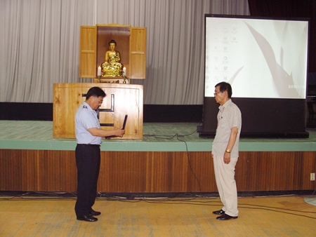 - [광주전남] 7월18일 (목) 목포교도소 강당 에 마련된 임시법당에서는 7월 세번쩨 정기 법 회가 불자 수용자 150여명이 참석한 가운데 우리 지역단 교정교화 목포교도소 팀장이며 교정위원인 수경 이종관 팀장과 우리 지역단 범진 정영균 단장(교 정위원)이 함께한 가운데 열렸다. 오늘은 법회에 앞서 전국 교정공무원 불자 회 문기두회장 으로 부터 수용자 교정교화와 교정인 불자연합회 발전에 기 여한 공로를 인정하여 수여되는 감사패를 범진 정영균단장에게 나상수 사회 복귀과장이 대신 전달하였다.이어서 진행된 법회 설법에서 범진 단장은 앞으 로 있을 여름 방학동안의 수행 활동 계획과 할 일등에 대한 안내를 하였으며 , 이어서 수경 팀장은 불자로써 크고 작은 자각의 경지에 이르기 위해서 는 부 단한 어려움과 연속된 고난의 극복과정을 거치고서만이 이루어 낼 수 있음을 여러 사례를 들어 설법하였다