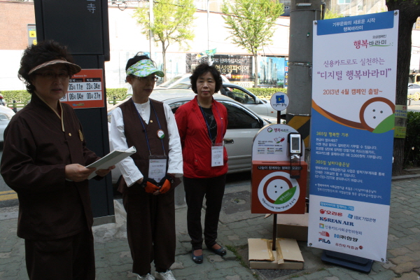 - [부산] 포교사단 부산지역단 기부문화의 새로운 시작 행복바라미 모금운동 신용카드로 결제하는 "디지털 행복바라미" 일시 : 불기 2557년 (2013년) 5월7일 장소 : 부산지하철 범어사 5번출구 앞 노상 포교사단 부산지역단에서는 기부문회의 새로운 시작 행복바라미 모금운동을 )법지행) 이숙례 지역봉사 총괄팀장을 팀장으로하여 오후 2시부터 오후 5시까지 지하철 범어사역 5번출구 앞에서 열심히 모급운동을 하고 있었다 아직 행복바라미에대한 홍보 부족과 시민들의 냉대한 마음에 모금은 잘 이루어 지지 않았지만 그 열정만은 대단한 감동적이었다 , 범어사에서 내려오는 불자들을 대상으로 부지런히 홍보하고 모급운동을 하였으나 그 결과는 아주 미약하기 그지 없었다, 또한 모금을 하고있는 포교사들은 길거리에서 홍보용 프랭카드도 없고 책상도 하나 없으며 몇시간을 서서 지나가는 시민들에게 행복바라미에 대한 홍보를 하였지만 그 수입금은 아주 저조하였다 다음에 또 이런 행사가 있으면 충분한 홍보를 하고난 뒤 시민들에게 공감을 주는 모금이 되었으면 한다 몇시간을 지켜보고 난 뒤 그 모습을 전합니다,