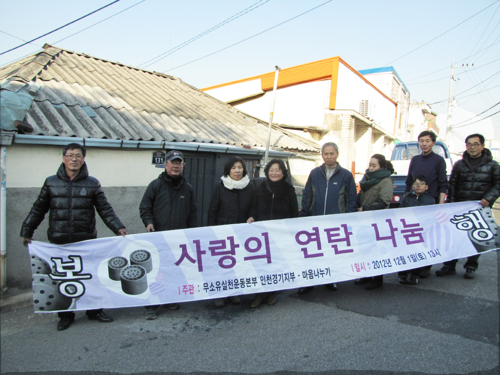 - [인천경기] 불기 2556년 12월 1일 토요일 오후 1시부터 인천시 동구 송림동 일대에서 무소유실천 운동본부 인천경기지부와 포교사단 인천경기지역단 자원봉사팀과 함께 사랑의 연탄나눔 행사를 진행하였습니다. 이 날은 천장의 연탄을 나누며 마음까지 따뜻한 하루가 되었는데요, 특히나 근처의 고등학생들이 용돈을 모아 연탄 천장을 기부하고, 배달까지 하여 저희들의 마음까지 따뜻해지는 감동을 느낄 수 있었습니다. 추운날 나와서 고생하신 전문기 단장을 비롯하여 자원봉사팀 모두 고생 많으셨습니다.