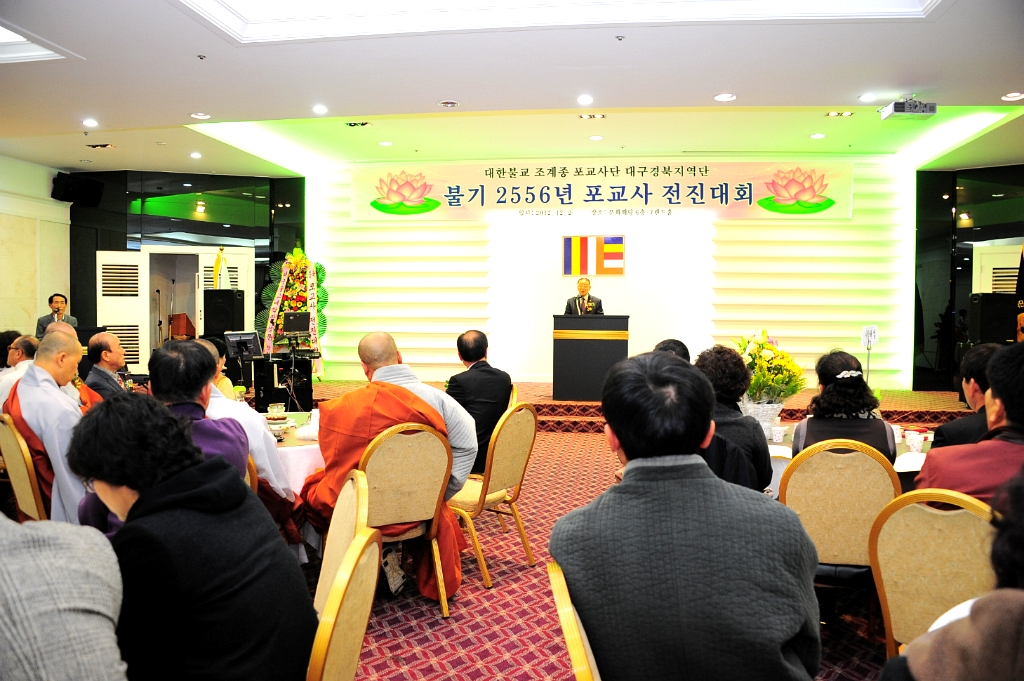 - [대구] 지난 12월 2일 대구문화웨딩 6층 그랜드홀에서, 대구경북 지역단의 2556년 한해를 마무리하는 포교사 전진대회가 포교사단 임희웅중앙단장님, 포교원 신도국장 덕산스님, 직지사 포교국장이자 포교국장협의회장이신 지도법사 민성스님, 동화사포교국장 미수스님, 불국사포교국장 성요스님등 내빈들을 모시고, 정법 장한상 지역단장을 비롯한 300 여명의 포교사들이 함께한 가운데 여법하게 열렸습니다. 1부 법요식및 표창수여, 2부 분야별 소개, 3부 만찬, 4부 팀 소개및 장기자랑의 순서로 진행된 이날 행사에서 모든 포교사들이 한해 동안의 노고를 서로 위로하며 새로운 전법 포교의 의지를 다지는 화합의 한마당이었고 축제의 자리가 되었습니다.