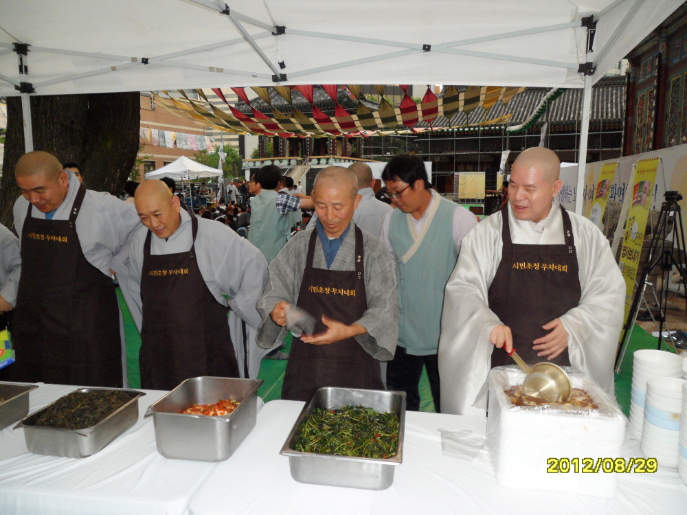 - [서울] 노동자와 함께하는 시민초청 무차대회 주 최 : 대한불교조계종 자성과쇄신결사추진본부 주 관 : 대한불교조계종 자성과쇄신결사추진본부, 비정규직 없는 세상만들기 네트워크 정리해고 . 비정규직. 노조탄압 없는 세상을 향한 투쟁사업장 공동투쟁단. 장 소 : 대한불교조계종 조계사 일 시 : 불기 2556년(2012) 8월29일 수요일 오후 6시 30분~10시. 후 원 : 대한불교조계종 종무원조합, 전국민주노동조합연맹, 쌍용자동차 희생자추모와 해고자복직을 위한 범국민대책위원회. 식 순 1부 : 노동자를 부처님으로 사회 (양한웅 대한불교조계종 자성과쇄신결사추진본부 통합사업팀장) 희생노동자를 위한 추모 타종및 묵념 인사말 : 자승스님(대한불교조계종 총무원장), 전국민주노동조합총연맹 수석부위원장. 저녁공양 (스님들께서 정성껏 대접하는 맛있는 식사. 2부 : 노동자, 불교와 만나다 사회 (일감스님 대한불교조계종 총무원 재무부장) 환영마당. 인사말 (도법스님, 종호스님) 발언 (통일문제연구소장) 공연 발언 편지글 서원문 (동환스님) 가수공연 폐회 및 전체율동 * 참여하여 봉사해주신 대한불교조계종 포교사단 서울지역단 포교사님들께 진심으로 감사드립니다.* 취재 남부총괄팀장 한애경 법용화 무차대회(無遮大會)란? 승속과 노소, 귀천을 가리지 않고 누구나 자유롭게 참여하여 법문을 듣고 잔치를 열어 물건을 베푸는 일종의 법회이다. 모든 중생에게 불법의 공덕이 골고루 미치도록 잔치를 즐기고 시주자가 물건을 베풀며 불경을 강의하였다. 불교의 무차대회는 보시정신에 근거하여 부처님의 덕과 자비를 모두에게 나누어 주는 신앙적 의미도 있다. 무차회의 기원은 인도 아쇼카왕(BC268~232년) 시대로 거슬러 올라간다. 아쇼타왕이 선지식을 모시고 차별없이 재물과 불법을 보시하는 자리를 마련했던 것이 무차대회의 시작이다. 중국 삼장법사 현장스님도 승려들 간의 논쟁을 불식시키기 위해 무차회를 연 적이 있다. 우리나라에서는 신라시대 때 무차회를 열었다는 기록이 남아있으며 고려사에는 태조23년 신흥사 공신당을 신축할 때 무차대회가 열렸고 의종 19년의 궁중 무차대회, 고종3년 미륵사 공신전 중수 후 무차대회가 열렸다는 기록이 있다. 근, 현대에 들어와서는 1896년 스님들의 도성출입 제한 해제를 기념하여 한국과 일본의 스님들이 공동으로 경서(현 서울)에서 수일간 열었으며 이후 전국의 사찰에서 크고 작은 무차회가 개최되었다. 1912년 방한암스님이 금강산 건봉사에서 무차선회회를 가진 이후 맥이 끊겼다가 1998년 장성 백양사에서 서옹스님의 원력에 의해 바른 법을 세우기 위한 대화의 장이 복원됐다. [화엄경에서의 '무차대시회' 언급] "온갖 살림살이에 소용되는 물건들을 보시하는 무차대시회를 베풀 때 그 가운데 중생의 갖가지 복밭들이 먼 데서 왔거나 가까운 데서 왔거나 어질거나 어리석거나 아름답거나 추하거나 남자거나 여자거나 사람이거나 아닌 것이거나 마음과 행동이 같지 않고 구하는 바가 저마다 다르더라도 평등하게 베풀어 모두 만족케 한다."