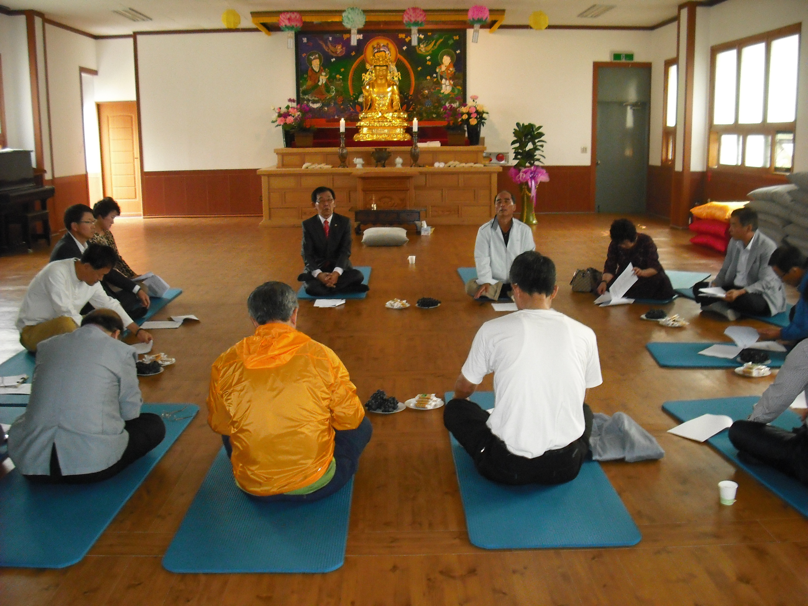 - [인천경기] 불기 2556년 9월 15일 토요일. 평소 운영위원회의를 진행 하던 지역단 사무실에서 벗어나 이 달에는 가 까운 근교의 인천경기지역단 소속 팀장이 운영하는 식당에서 운영위원회의를 진행하였습니다. 이날 운영위원회의에서는 지난달 운영위 결과 보고와 한 달동안 있었던 경과 보고를 하고, 다음으로는 안건 상정하여 회의를 진행하였습니다. 9월 8일 송광사에서 치뤘던 팔재계에 대한 평가가 있었고, 팀장 연수에 관한 건도 진행하여 11월 희망하시는 운영위원들을 대상으로 백령도 몽운사에서 1박2일 진행하 기로 의결하였습니다. 회의를 마치고 8재계 표창장 수여식이 있었습니다. 참여율이 가장 높았던 군3팀(팀장 남시우)에 금일 봉과 함께 표창장이 수여되었습니다. 식사와 함께 담소를 나누며 즐거운 운영위원회의가 진행되었습니다.